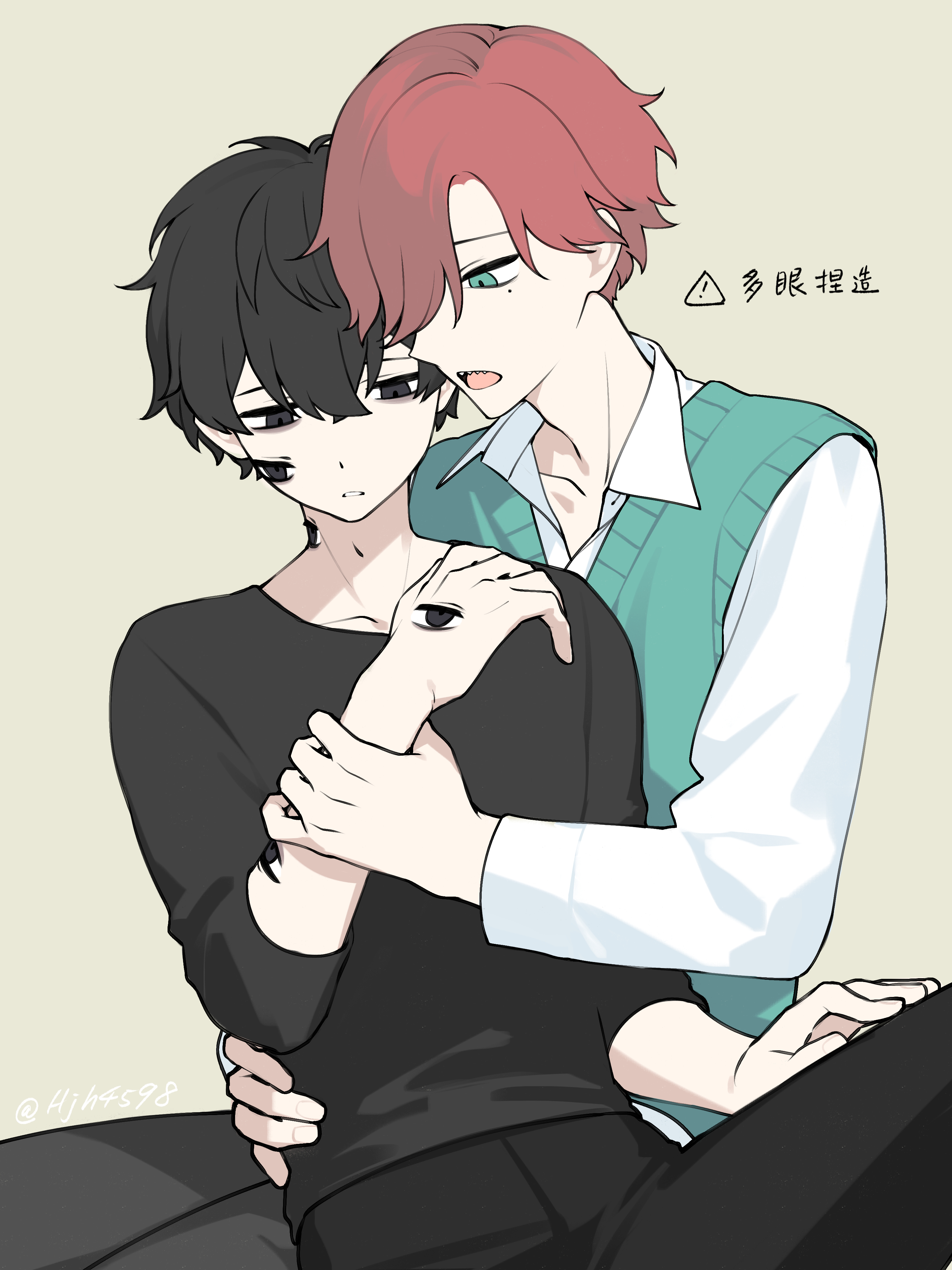 2boys absurdres aqua_eyes aqua_sweater_vest bags_under_eyes black_eyes black_hair black_pants black_shirt cheek_eye collared_shirt commentary_request dress_shirt extra_eyes hand_eye hand_on_another's_hip hand_on_another's_wrist highres holding_another's_wrist jh kuchinashi_dabi male_focus mole mole_under_eye multiple_boys neck_eye open_collar oshi_no_tachiba_ga_irekawaru pants red_hair sharp_teeth shirt short_hair sitting sweater_vest teeth three-quarter_sleeves tonimura_yui white_shirt yaoi yellow_background