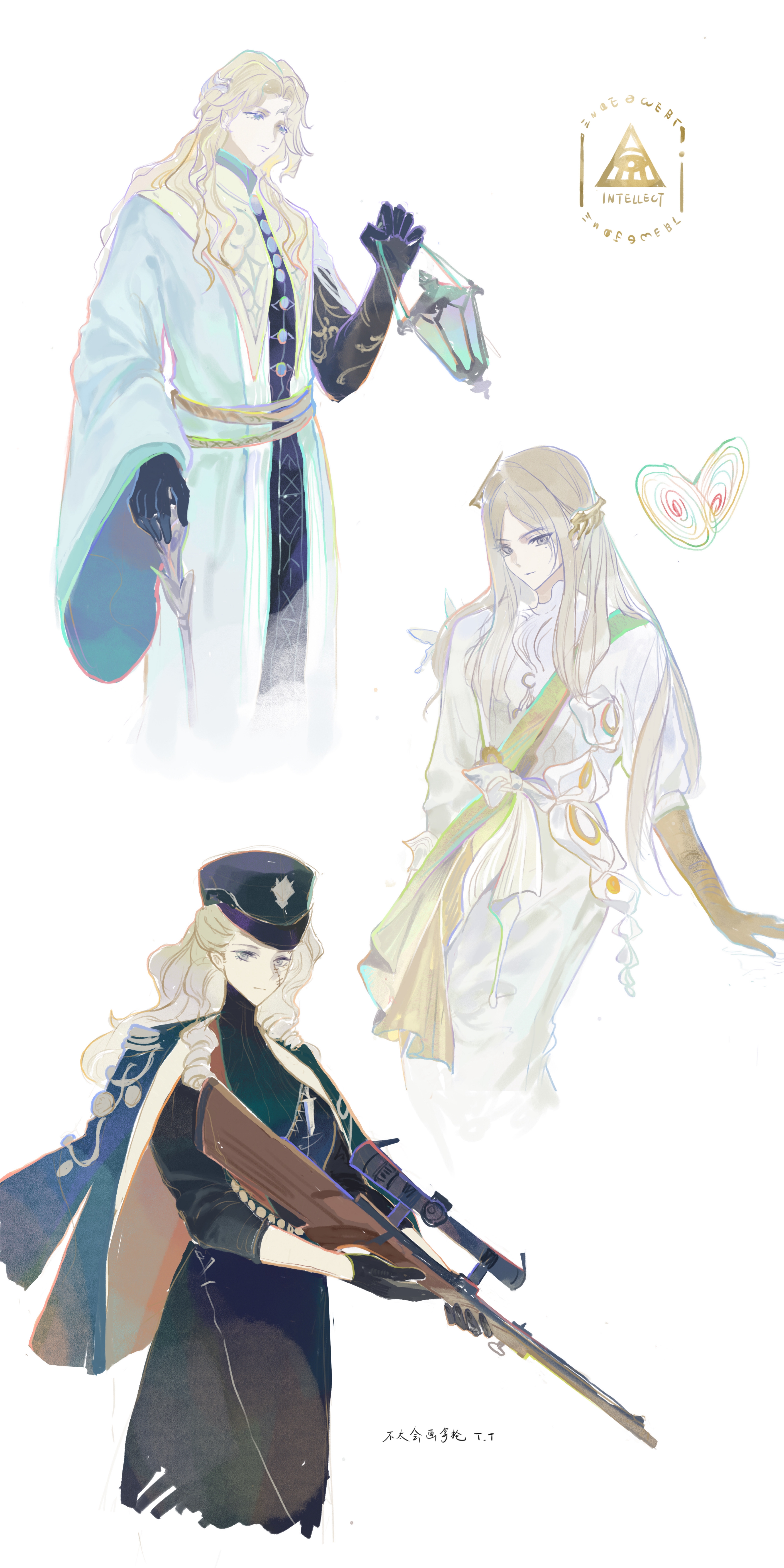 1boy 2girls 6_(reverse:1999) absurdres black_coat black_dress black_gloves black_hat blonde_hair blue_eyes cane chinese_commentary chinese_text coat coat_on_shoulders commentary_request corvus_(reverse:1999) cowboy_shot cropped_torso dress fufuy. gloves grey_eyes grey_hair grey_skirt gun hair_ornament hat highres holding holding_cane holding_gun holding_lantern holding_weapon lantern long_hair long_skirt lorentz_butterfly mole mole_under_eye multiple_girls official_alternate_costume peaked_cap reverse:1999 rifle robe shirt single_glove skirt stitched_face stitches translation_request weapon white_background white_robe white_shirt yellow_gloves