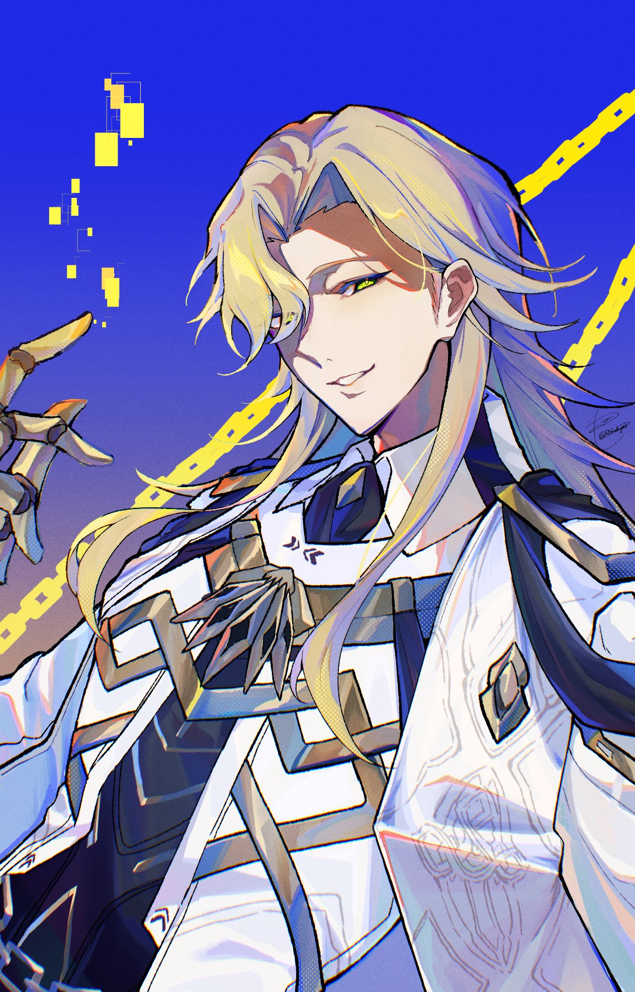 1boy blonde_hair blue_background chain chinese_commentary commentary eyes_visible_through_hair film_grain gold_chain green_eyes grin hair_over_one_eye hand_up highres honkai_(series) honkai_impact_3rd long_hair looking_at_viewer male_focus rekodayo13 sidelocks simple_background smile solo stole upper_body void_archives