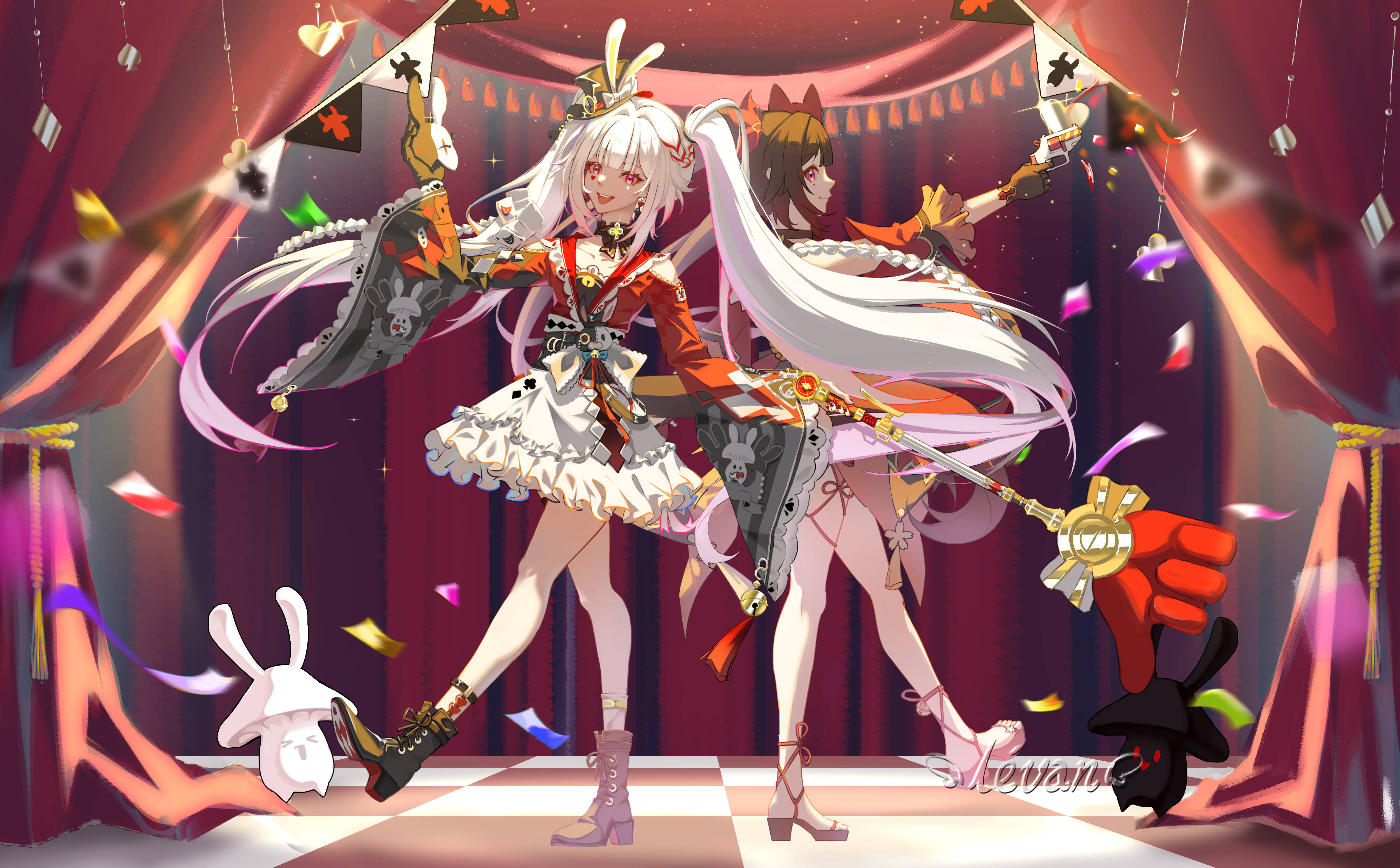 2girls absurdres back bare_legs bare_shoulders black_boots black_choker black_gloves black_hair black_hat black_sash boots braid breasts brown_hair butterfly-shaped_pupils choker circle_facial_mark circus clothing_cutout commentary_request criss-cross_halter curtains detached_sleeves diamond_(shape) diamond_facial_mark diamond_on_cheek dress facial_mark floor flower_tattoo fox_mask frilled_dress frills from_behind from_side gloves gun halterneck handgun hat hat_ornament heart heart_facial_mark heart_on_cheek highres holding holding_gun holding_mask holding_weapon honkai:_star_rail honkai_(series) liwan long_hair long_sleeves looking_at_viewer looking_back mark_under_both_eyes mask mask_on_head mini_hat mini_top_hat multicolored_hair multiple_girls open_mouth pink_eyes plaid_clothes plaid_sleeves rabbit_ear_headwear rabbit_hat_ornament red_dress red_sleeves revolver sash shadow shoulder_cutout single_glove smile snubnosed_revolver sparkle_(honkai:_star_rail) sparxie_(honkai:_star_rail) stage standing standing_on_one_leg supplicant_mask symbol-shaped_pupils tattoo thumbs_up_emoji top_hat twintails very_long_hair waraji weapon white_hair