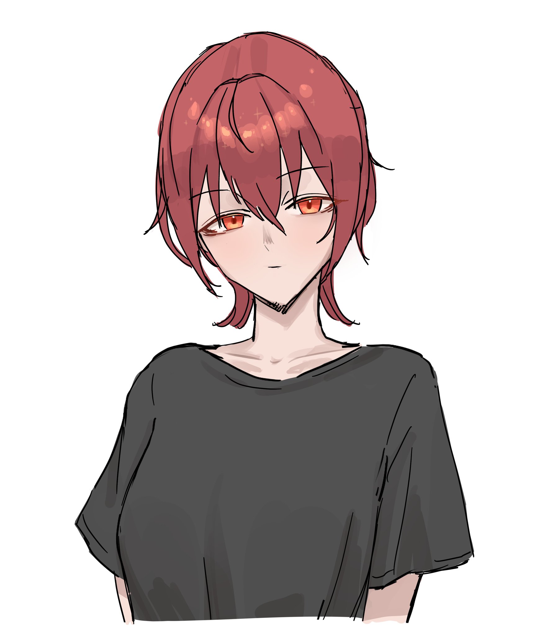1girl black_shirt expressionless highres looking_at_viewer original red_eyes red_hair shirt short_hair short_sleeves sketch turnipdish white_background