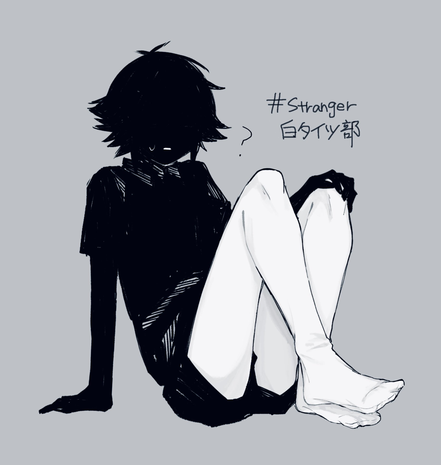1boy ? antenna_hair arm_support black_shirt black_shorts black_sweater_vest collared_shirt commentary_request grey_background hand_on_own_knee highres male_focus omori pantyhose parted_lips sano_gameya shirt short_hair short_sleeves shorts sidelocks simple_background sitting solo stranger_(omori) sweatdrop sweater_vest translation_request white_pantyhose