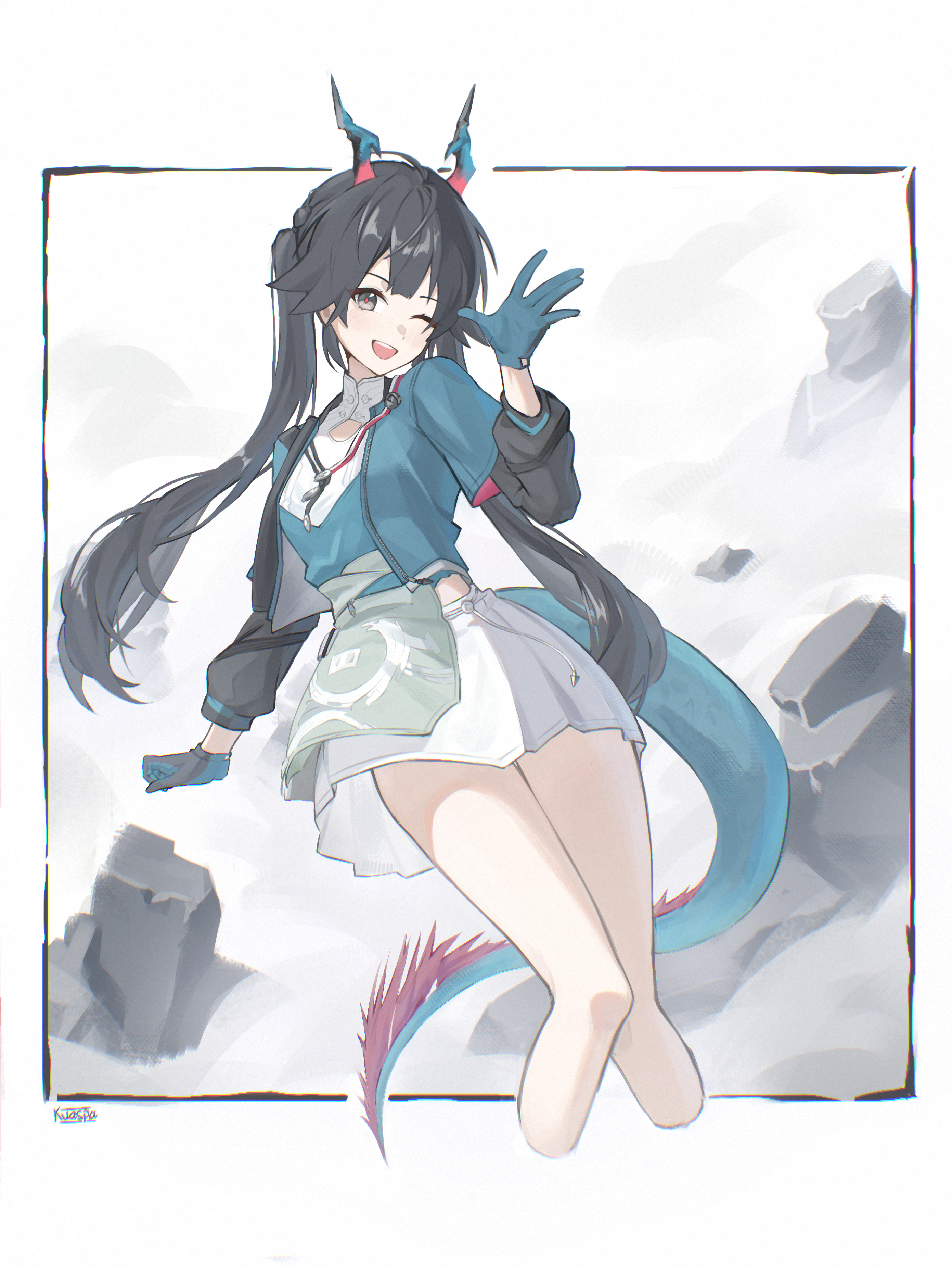 1girl absurdres arknights arknights:_endfield black_hair blue_gloves blue_jacket blue_shirt blush chen_qianyu_(arknights) commentary dragon_girl dragon_horns dragon_tail gloves grey_eyes highres horns jacket kuaspa layered_sleeves long_hair long_sleeves looking_at_viewer mandarin_collar one_eye_closed open_mouth shirt short_over_long_sleeves short_sleeves skirt solo tail twintails white_shirt white_skirt