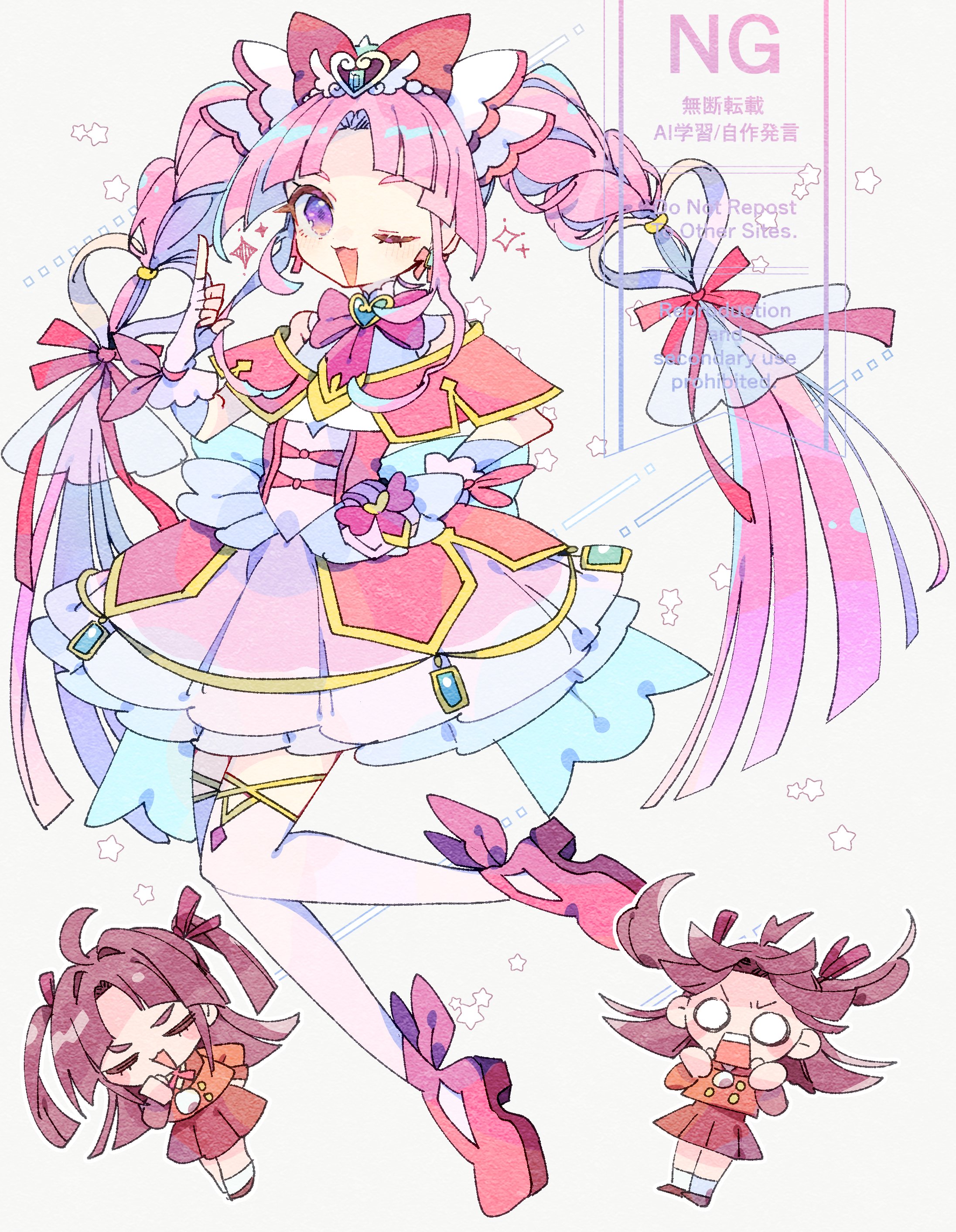 1girl ;d absurdres ahoge blunt_bangs blunt_ends blush blush_stickers bow braid brown_hair brown_shoes chibi closed_eyes commentary cure_mystique dress fingerless_gloves frilled_dress frills full_body gloves hair_bow hair_intakes hand_on_own_hip hand_up highres index_finger_raised kobayashi_mikuru long_hair magical_girl meitantei_precure! multiple_views nikorashi-ka o_o one_eye_closed open_mouth orange_shirt pink_dress pink_eyes pink_hair pink_shoes pleated_skirt precure red_bow red_skirt shirt shoes short_sleeves skirt smile socks star_(symbol) thighhighs twin_braids two_side_up v-shaped_eyebrows watermark white_gloves white_socks white_thighhighs