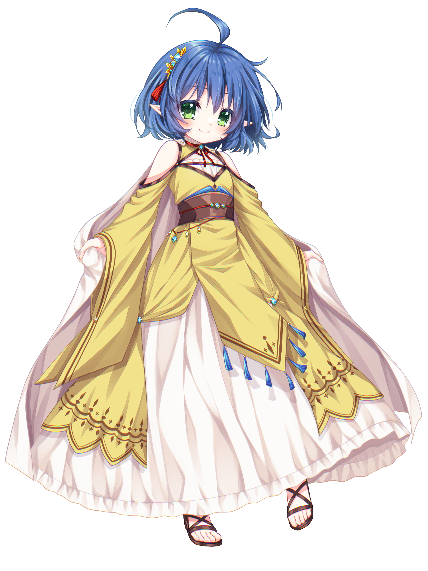 1girl ahoge airy_windia asazuki_kanai blue_gem blue_hair breasts cape detached_sleeves dress full_body gem green_eyes hair_ornament highres long_sleeves looking_at_viewer root_eden sandals small_breasts smile standing transparent_background white_cape wide_sleeves yellow_dress