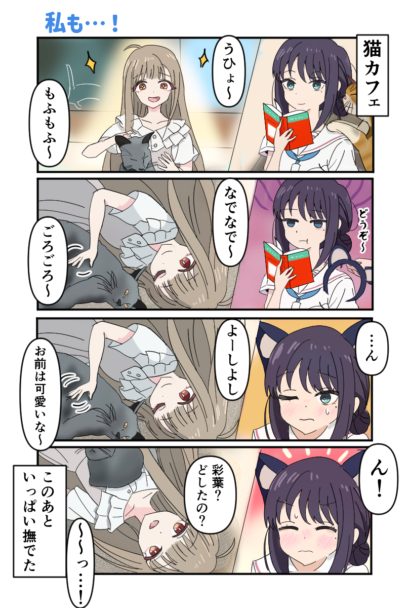 2girls :t animal_ears black_hair blush book brown_hair cat cat_ears cho_kaguya-hime! closed_eyes commentary green_eyes hair_bun highres holding holding_book jealous kaguya_(cho_kaguya-hime!) looking_at_another mole mole_under_eye multiple_girls one_eye_closed open_book open_mouth partially_translated petting red_eyes rokugatsu_no_yoru sakayori_iroha smile sweat translation_request upper_body