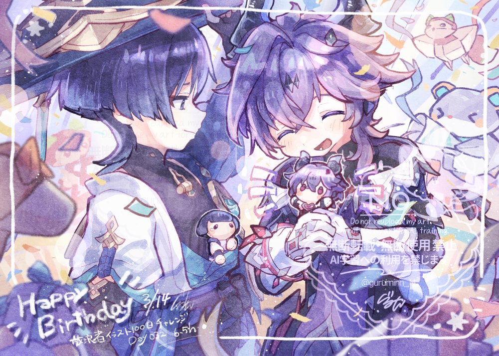 2boys anemo_symbol_(genshin_impact) arm_at_side arm_up belt birthday black_belt black_bodysuit black_bow black_bridal_gauntlets black_coat black_horns black_shirt black_tail blue_cape blue_gem blue_hat blue_jingasa blue_kimono blue_sleeves blunt_ends blurry blush bodysuit bow box bridal_gauntlets cape character_doll closed_eyes closed_mouth coat collared_coat commentary_request confetti contrast_collar copyright_notice crossed_bangs dated depth_of_field doll dragon_boy dragon_horns dragon_tail durin_(genshin_impact) eyeliner facial_mark facing_another forehead_mark gem genshin_impact gift gift_box gloves gold gurumin_(gurruguru) hair_between_eyes hamster happy happy_birthday hat holding holding_stuffed_toy horns japanese_clothes jingasa juban kimono layered_sleeves looking_at_another lower_teeth_only makeup mandarin_collar multiple_boys notice_lines open_clothes open_coat open_collar open_kimono open_mouth own_hands_together party_popper purple_hair purple_rope purple_sash purple_vest red_eyeliner red_gem red_ribbon ribbon rope sash scaramouche_(genshin_impact) shirt short_sleeves shoulder_peek side_cape sideways_mouth squirrel stuffed_animal stuffed_toy tail teeth tongue toy tsurime vest viewfinder wanderer_(genshin_impact) white_gloves white_kimono white_sleeves