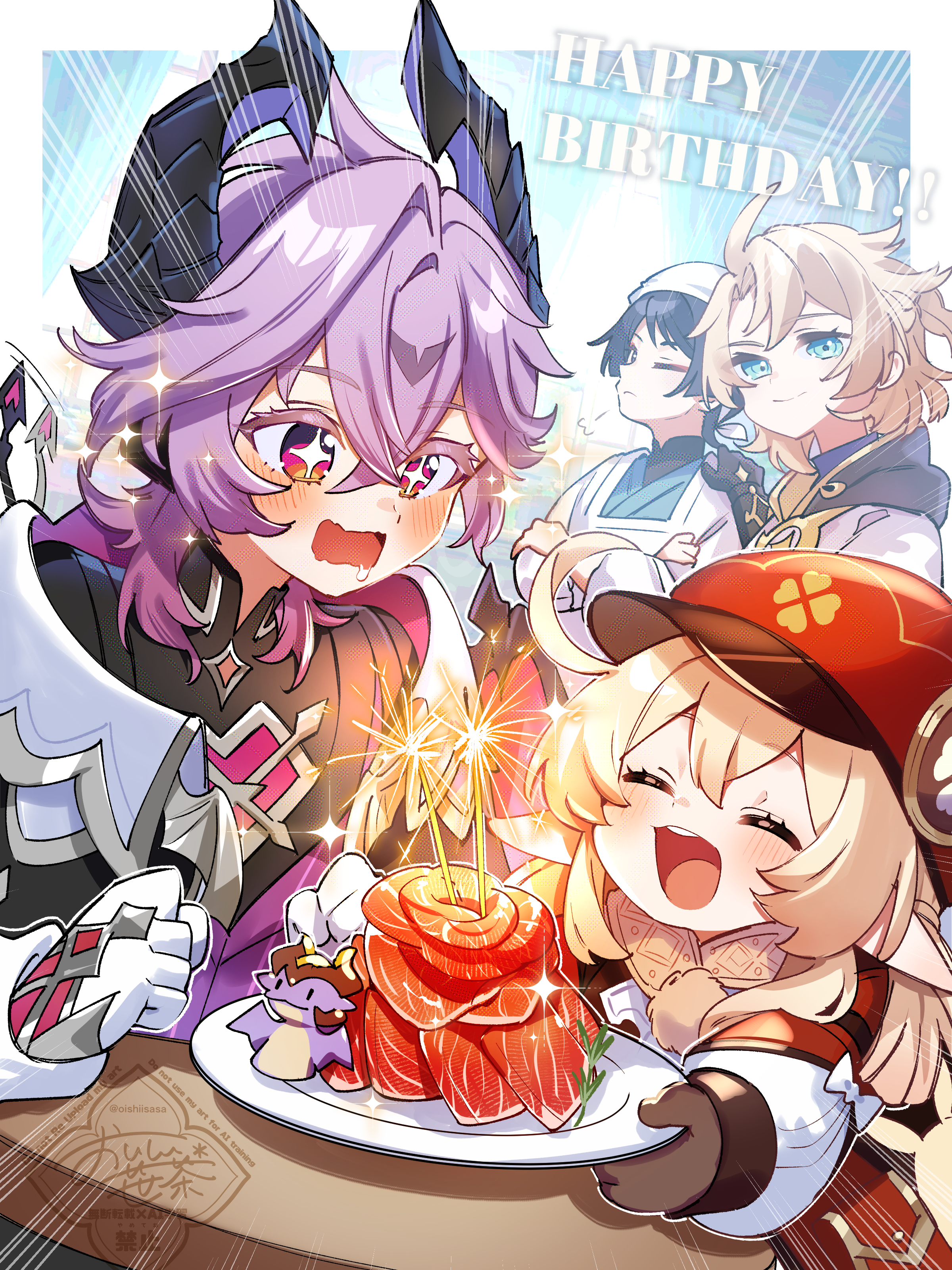 +_+ 1girl 3boys absurdres ahoge albedo_(genshin_impact) apron black_coat black_gloves black_hair black_hood black_horns black_shirt black_tail blonde_hair blue_eyes blue_kimono blunt_ends blush border bow braid brown_gloves brown_scarf buck_teeth character_doll chest_jewel clenched_hands closed_eyes closed_mouth clover_print coat collared_coat colored_eyelashes commentary_request contrast_collar crossed_arms crossed_bangs doll dragon_boy dragon_horns dragon_tail dress drooling durin_(genshin_impact) emphasis_lines eyelashes eyeliner facial_mark fireworks food food_request forehead_mark gem genshin_impact gloves gold_trim hair_between_eyes half_up_braid hand_on_another's_shoulder hands_on_another's_arms happy_birthday hat heart-shaped_gem highres holding holding_food hood hood_down hooded_coat horns japanese_clothes kappougi kimono klee_(genshin_impact) layered_sleeves long_sleeves looking_at_another looking_at_food low_twintails makeup mandarin_collar meat medium_hair mini_durin_(genshin_impact) mouth_drool multiple_boys newsboy_cap oishii_sasa one_eye_closed open_clothes open_coat open_mouth orange_eyes pink_gem pointy_ears pom_pom_(clothes) puff_of_air purple_hair purple_horns purple_vest red_dress red_eyeliner red_hat red_sleeves saliva scaramouche_(genshin_impact) scarf shirt sleeve_bow smile sparkler sparkling_eyes split_mouth table tail tail_wagging teeth tenugui tongue twintails twitter_username two-sided_horns upper_teeth_only vest wanderer_(genshin_impact) watermark white_apron white_border white_bow white_coat white_gloves white_sleeves wing_ornament