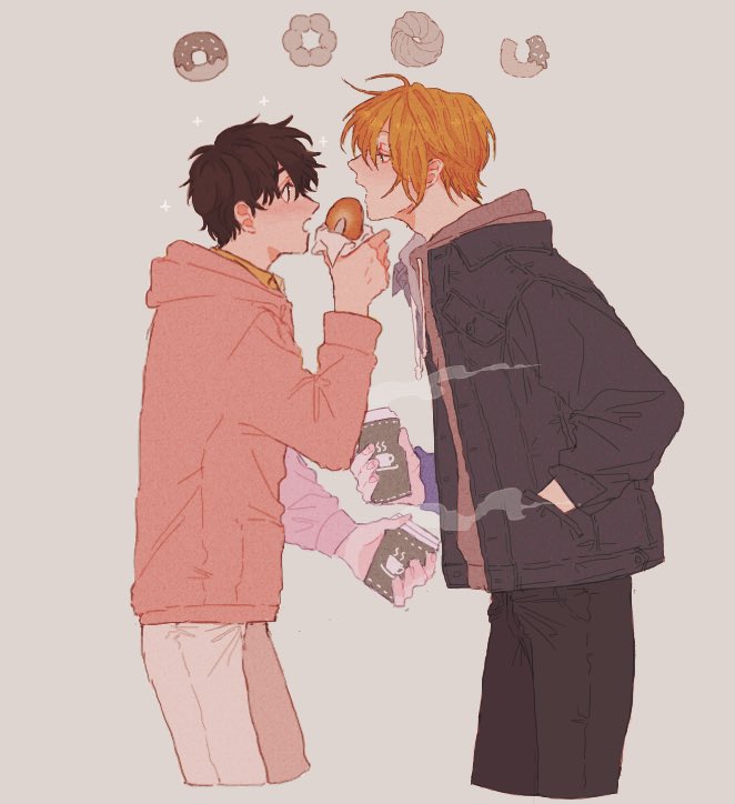 2boys a_co_pi ash_lynx banana_fish black_hair black_jacket black_pants blonde_hair brown_hoodie coffee commentary_request cropped_legs cup disposable_coffee_cup disposable_cup donut drawstring eye_contact food food_wrapper from_side grey_background hand_in_pocket holding holding_cup holding_donut holding_food hood hood_down hoodie jacket long_sleeves looking_at_another male_focus multiple_boys okumura_eiji open_mouth pants parted_bangs profile red_hoodie steam white_pants yaoi