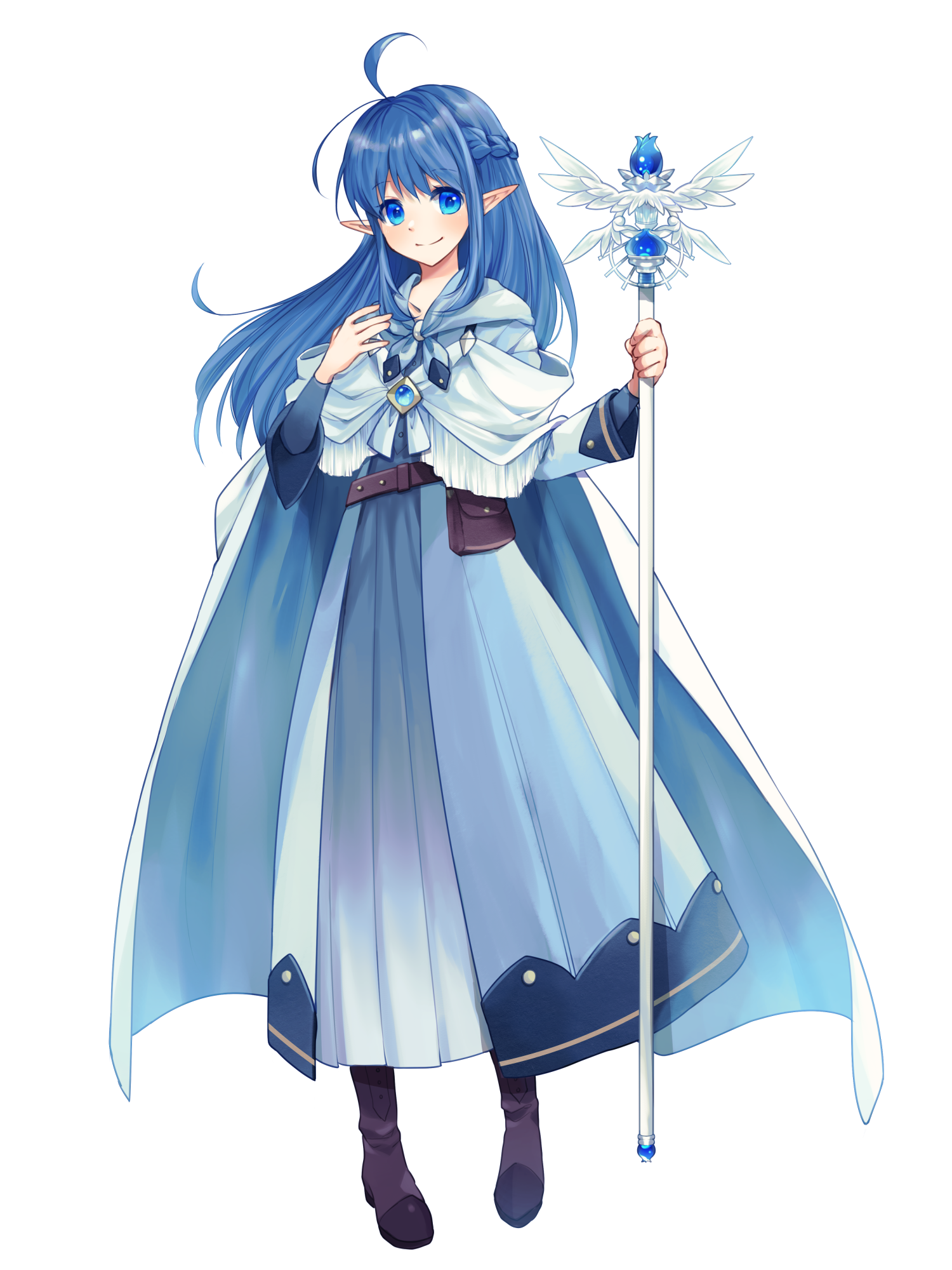 ahoge belt black_boots blue_eyes blue_gem blue_hair boots braid cape dress full_body gem highres light_smile long_hair long_sleeves looking_at_viewer pic_eda pointy_ears pouch root_eden sil_windia smile staff