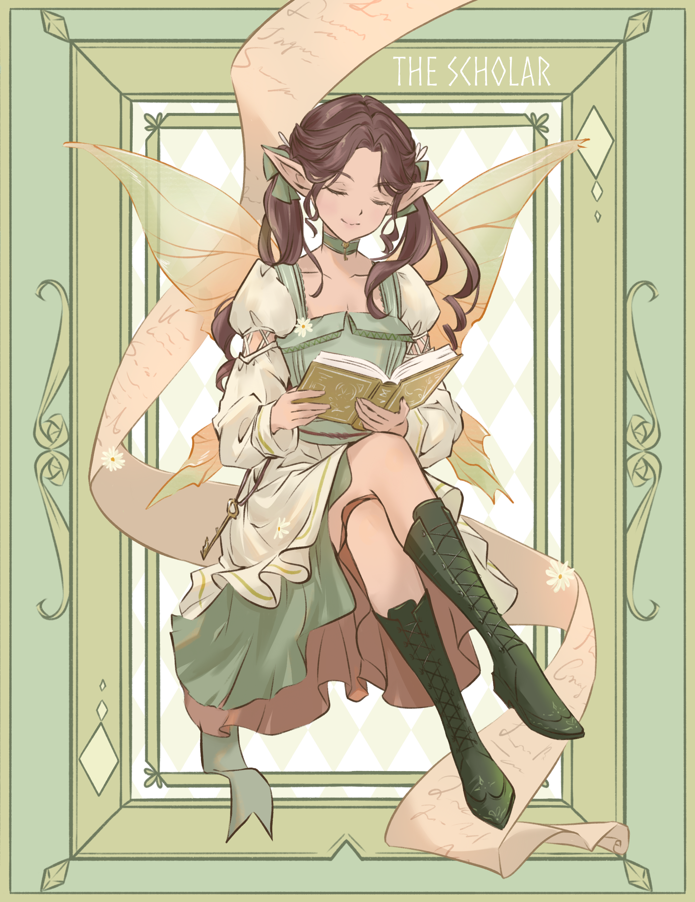 1girl absurdres anabellnordin book boots bow brown_hair choker closed_eyes closed_mouth collarbone crossed_legs detached_sleeves dress elf english_text fairy fairy_wings flower green_background green_boots green_choker green_dress hair_bow highres holding holding_book knee_boots long_hair long_sleeves original pointy_ears solo twintails wide_sleeves wings