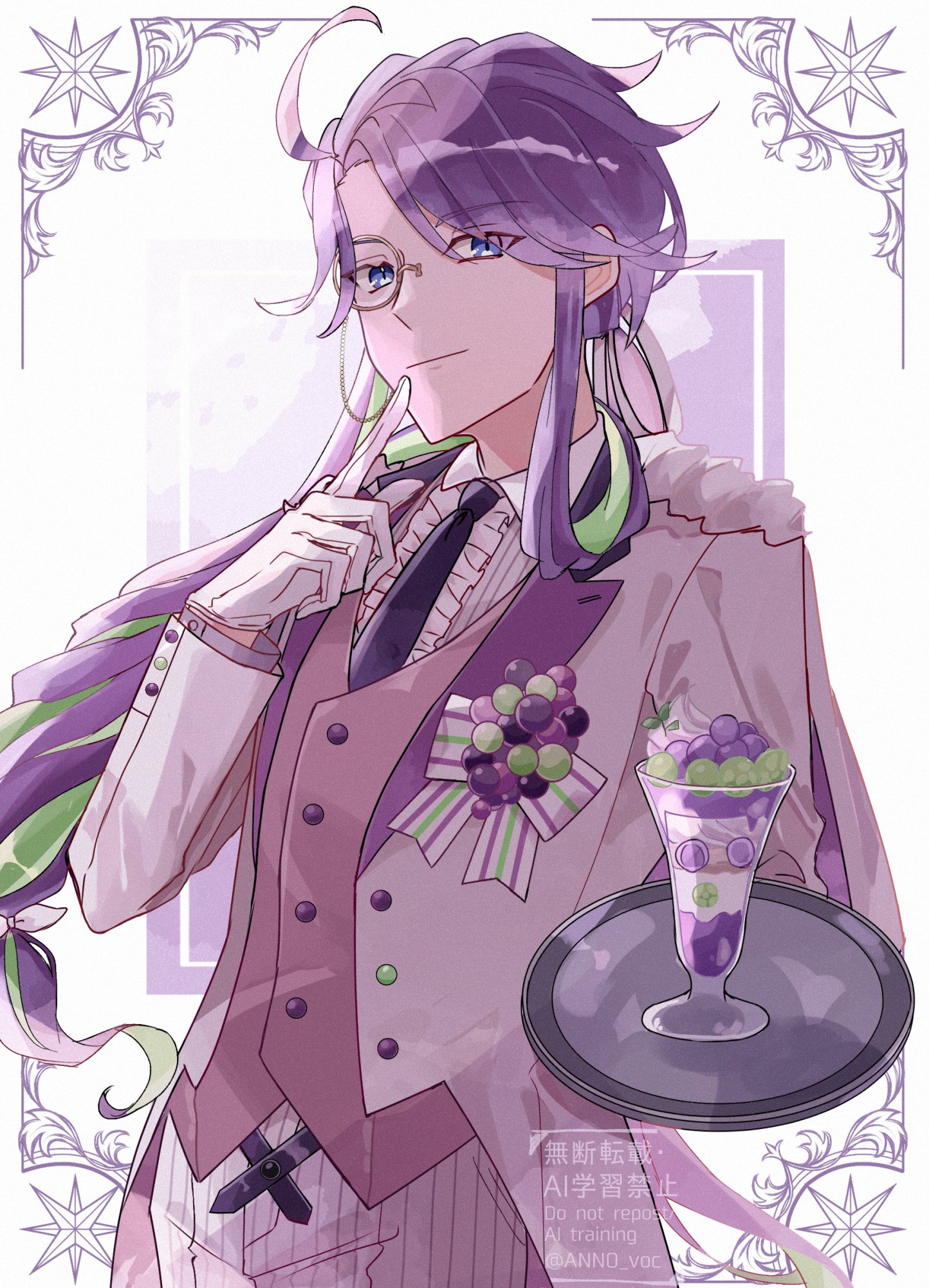 1boy ahoge anno_voc black_necktie blue_eyes border bow center_frills closed_mouth coat colored_inner_hair commentary_request cowboy_shot finger_to_mouth food frills fruit gloves grapes green_hair hair_bow highres holding holding_tray index_finger_raised inset_border kamui_gakupo layered_sleeves light_smile long_hair long_sleeves low_ponytail male_focus monocle multicolored_hair necktie official_alternate_costume ornate_border pants parfait pink_vest ponytail purple_background purple_hair shirt solo striped_clothes striped_pants tray vest vocaloid watermark white_background white_bow white_coat white_gloves white_pants white_shirt
