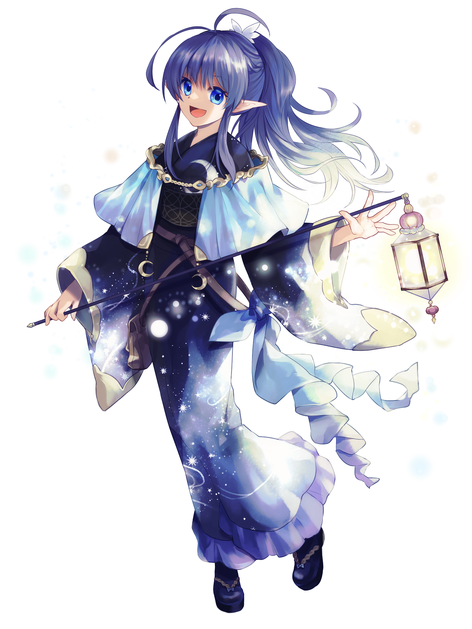 1girl antenna_hair blue_eyes blue_hair capelet crescent elf full_body highres japanese_clothes kimono lantern long_sidelocks looking_at_viewer moon_print pic_eda pointy_ears ponytail root_eden sandals sidelocks sil_windia smile socks solo star_(symbol) star_print transparent_background white_capelet wide_sleeves