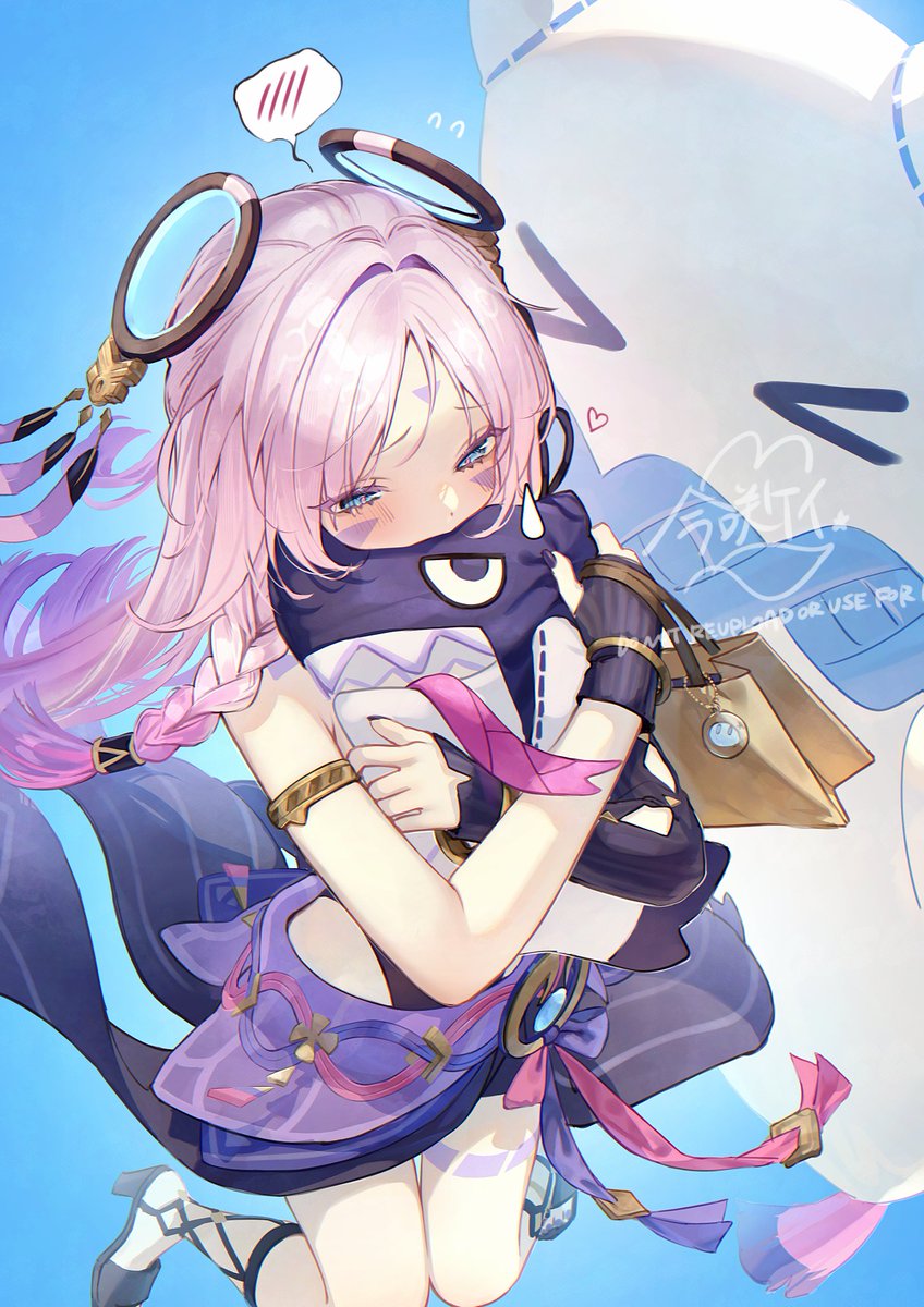 >_< 1girl armlet bare_shoulders black_leotard blue_eyes blush braid citlali_(genshin_impact) citlalin_(genshin_impact) commentary_request facial_mark fingerless_gloves floating_headgear forehead_mark genshin_impact gloves gold_armlet gradient_hair hair_intakes headgear heart highres hugging_object imasaki_kei itzpapa_(genshin_impact) jewelry leotard long_hair multicolored_hair pink_hair pink_pupils purple_hair single_fingerless_glove spoken_blush sweatdrop triangle triangle_facial_mark very_long_hair