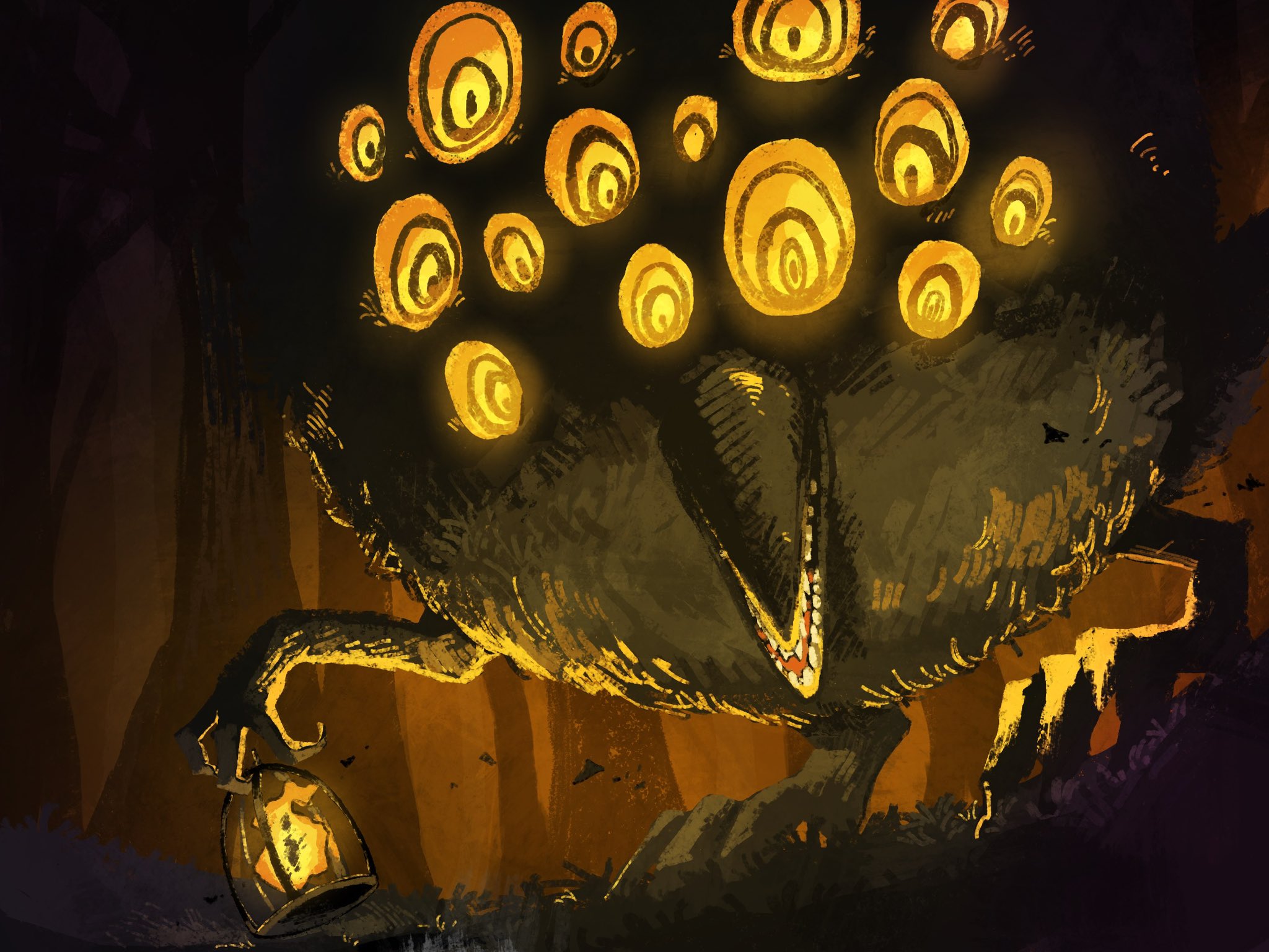 akns_lblb beak big_bird_(project_moon) commentary_request extra_eyes fire forest glowing glowing_eyes highres holding holding_lantern lantern lobotomy_corporation monster monster_focus nature no_humans project_moon ringed_eyes sharp_teeth talons teeth yellow_eyes