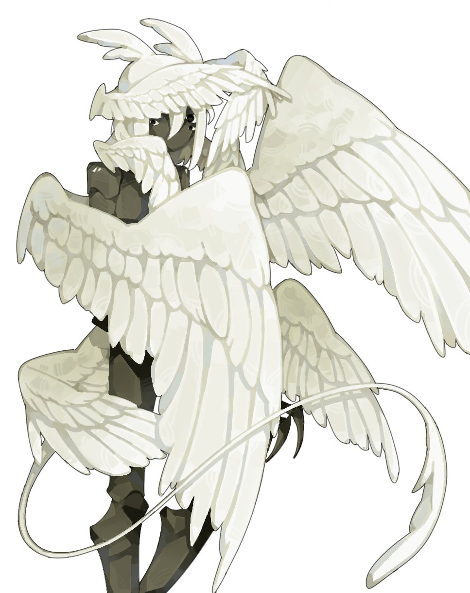 1other alicezakat angel_wings claws colored_skin commentary dragon_horns dragon_tail english_commentary extra_eyes grey_skin highres horns joints looking_at_viewer multiple_wings original other_focus simple_background solo tail white_background wings