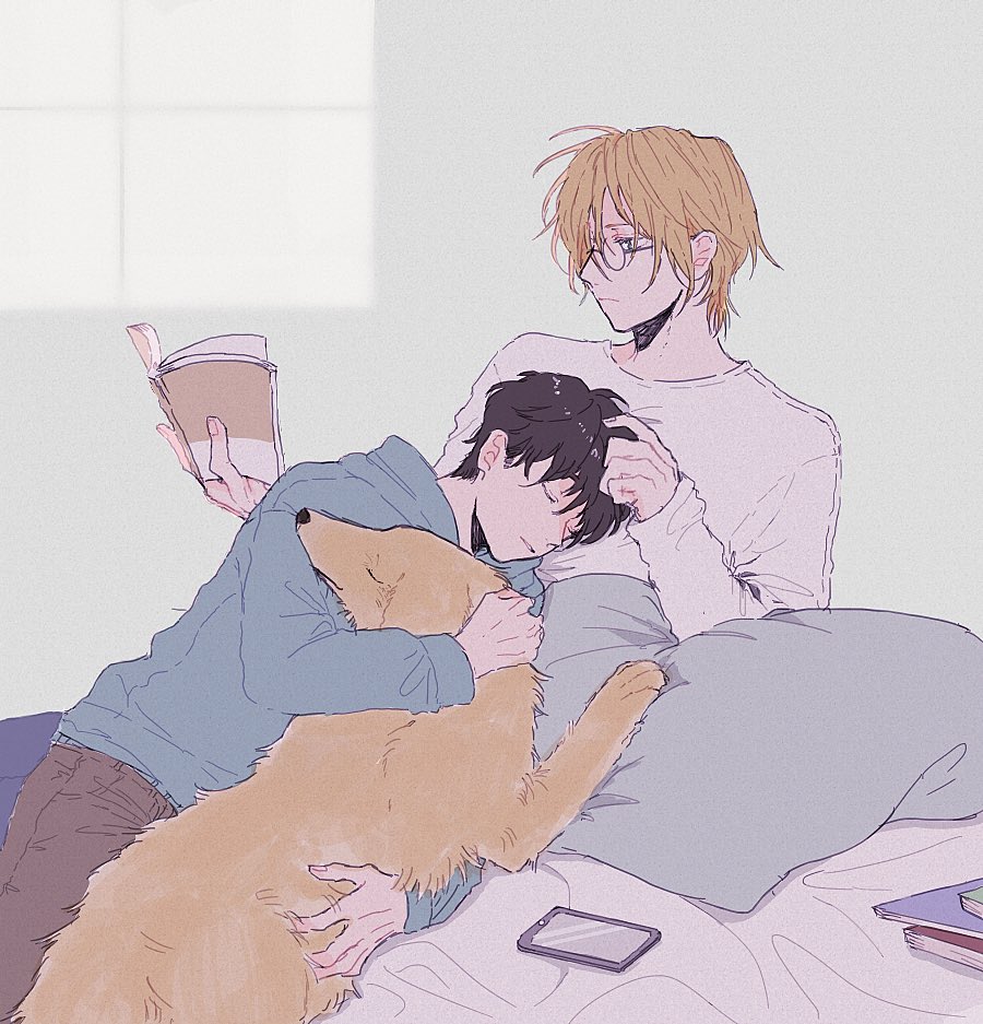 2boys a_co_pi animal ash_lynx banana_fish bespectacled black_hair blonde_hair blue_shirt book brown_pants closed_eyes commentary_request crew_neck dog glasses hair_behind_ear hand_in_another's_hair holding holding_book hug indoors long_sleeves male_focus multiple_boys okumura_eiji open_book pants pillow reading shirt white_shirt window_shadow yaoi