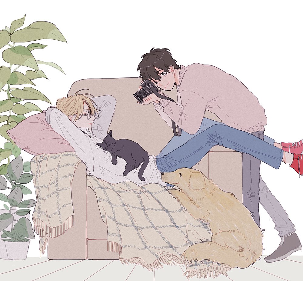 2boys a_co_pi animal arms_up ash_lynx banana_fish black_cat black_hair black_shoes blanket blonde_hair blue_pants brown_eyes camera cat chair commentary denim dog glasses grey_pants grey_shirt grey_sweater holding holding_camera jeans long_sleeves male_focus multiple_boys okumura_eiji pants parted_hair pillow plant potted_plant red_shoes shirt shoes sitting sleeping standing sweater untranslatable_commentary white_background
