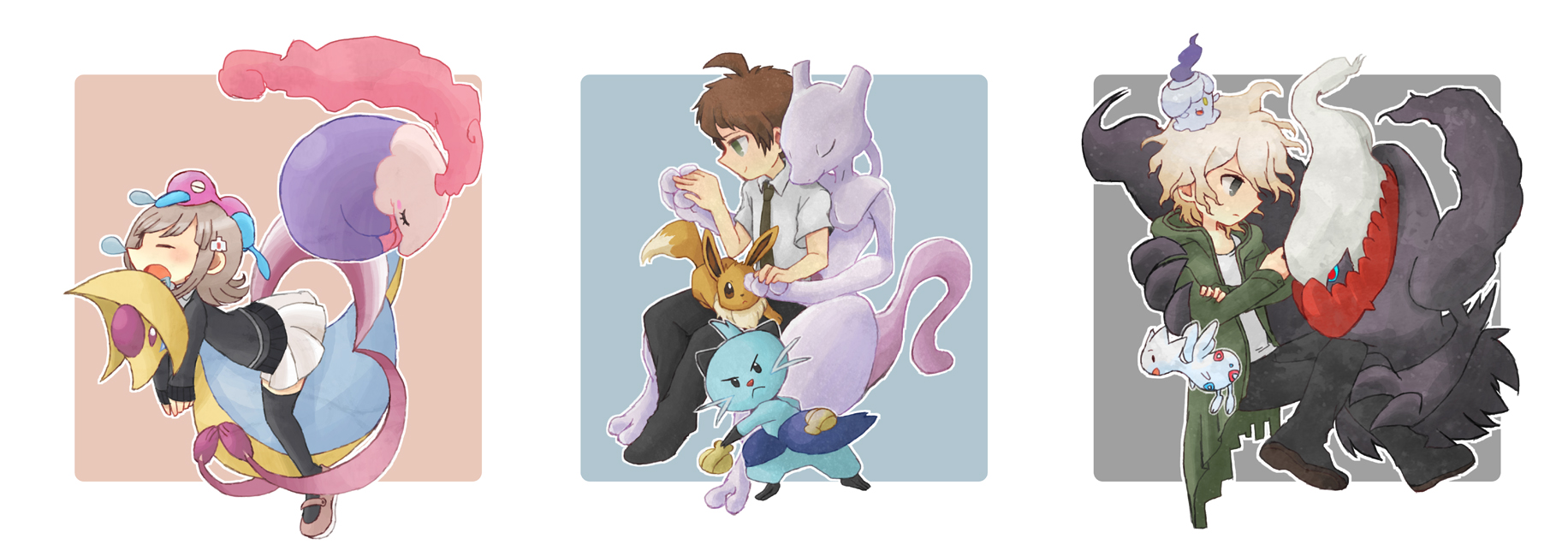 1girl 2boys brown_hair candle commentary_request cresselia crossover danganronpa_(series) danganronpa_2:_goodbye_despair darkrai dewott eevee gen_1_pokemon gen_2_pokemon gen_4_pokemon gen_5_pokemon green_jacket highres hinata_hajime jacket komaeda_nagito legendary_pokemon litwick mewtwo mizutaki_gutugutu multiple_boys musharna mythical_pokemon nanami_chiaki nintendo otter partial_commentary pokemon pokemon_(creature) pokemon_team porygon2 sleeping togetic white_background white_hair