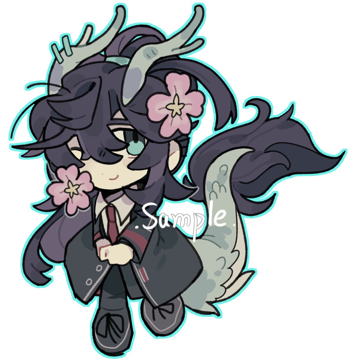 1boy ;) black_coat black_hair black_pants black_shoes blue_outline chibi chinese_commentary closed_mouth coat collared_shirt commentary_request dragon_boy dragon_horns dragon_tail eastern_dragon_horns eastern_dragon_tail flower full_body green_eyes hair_between_eyes hair_flower hair_ornament highres hong_lu_(project_moon) hopps_704 horns limbus_company long_hair long_sleeves looking_at_viewer male_focus necktie one_eye_closed outline pants pink_flower ponytail project_moon qilin_(mythology) red_necktie shirt shoes simple_background smile solo tail white_background white_shirt wing_collar