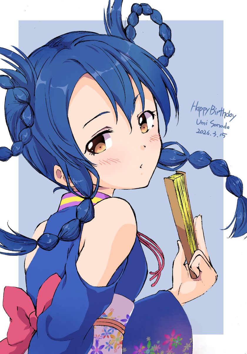 1girl angelic_angel back_bow bare_shoulders blue_background blue_hair blue_kimono border bow braid braided_hair_rings brown_eyes character_name closed_mouth commentary_request dated folded_fan folding_fan hair_rings hand_fan happy_birthday highres holding holding_fan japanese_clothes kimono looking_back love_live! love_live!_school_idol_project obi official_alternate_costume outside_border red_bow sash sen_(sen0910) simple_background solo sonoda_umi upper_body white_border