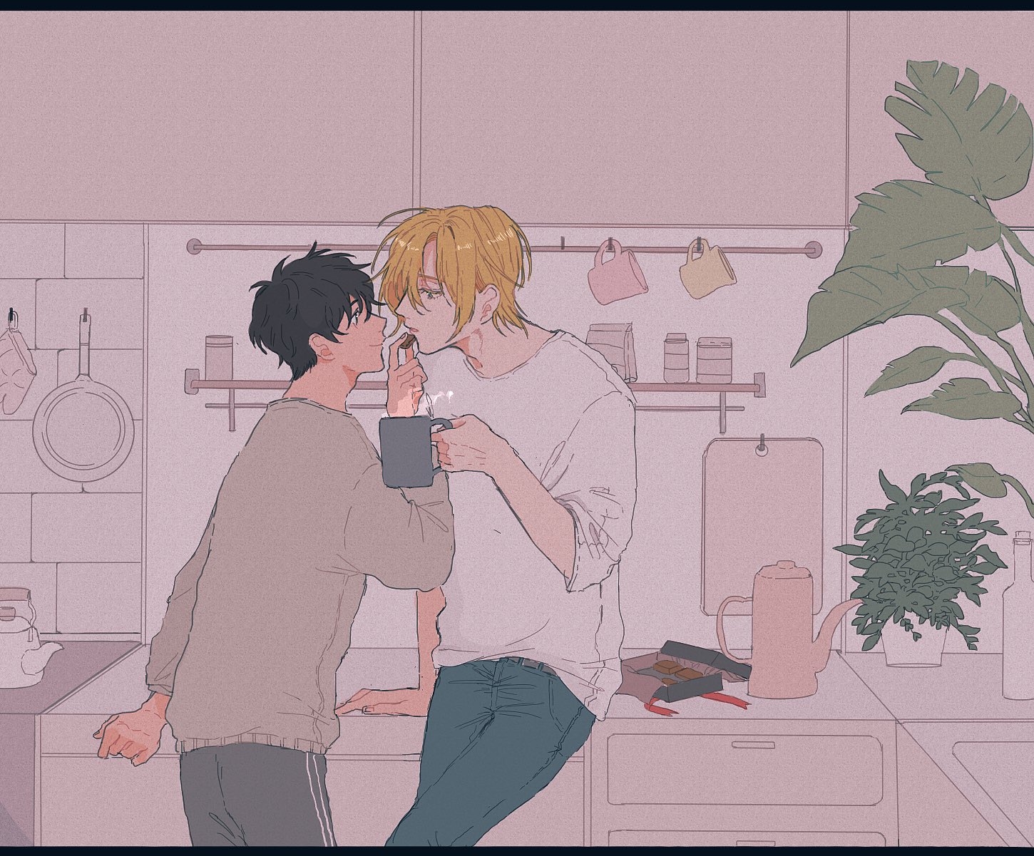 2boys a_co_pi arm_support ash_lynx banana_fish black_hair black_pants blue_eyes blue_pants brown_eyes closed_mouth coffee_mug commentary_request crew_neck crossed_legs cup cupboard cutting_board feeding food frying_pan grey_shirt hair_behind_ear highres holding holding_cup holding_food indoors kettle kitchen male_focus mug multiple_boys okumura_eiji pants parted_bangs plant potted_plant shirt short_hair steam tile_wall tiles white_shirt yaoi