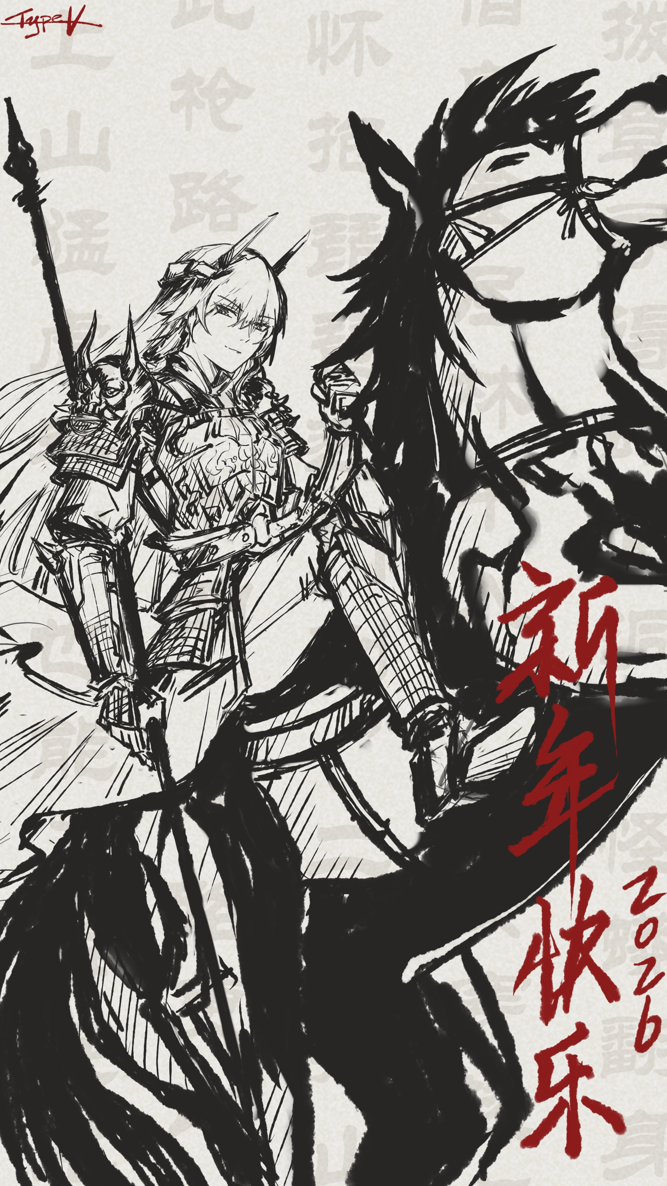 1girl 2026 absurdres alternate_costume armor artist_name closed_mouth commentary_request dou haidate hair_between_eyes hand_up headgear highres holding holding_polearm holding_weapon horse horseback_riding japanese_armor kote kusazuri looking_at_viewer mechanical_arms polearm punishing:_gray_raven riding shoulder_armor smile sode solo type-v vera:_geiravor_(pgr) vera_(pgr) weapon