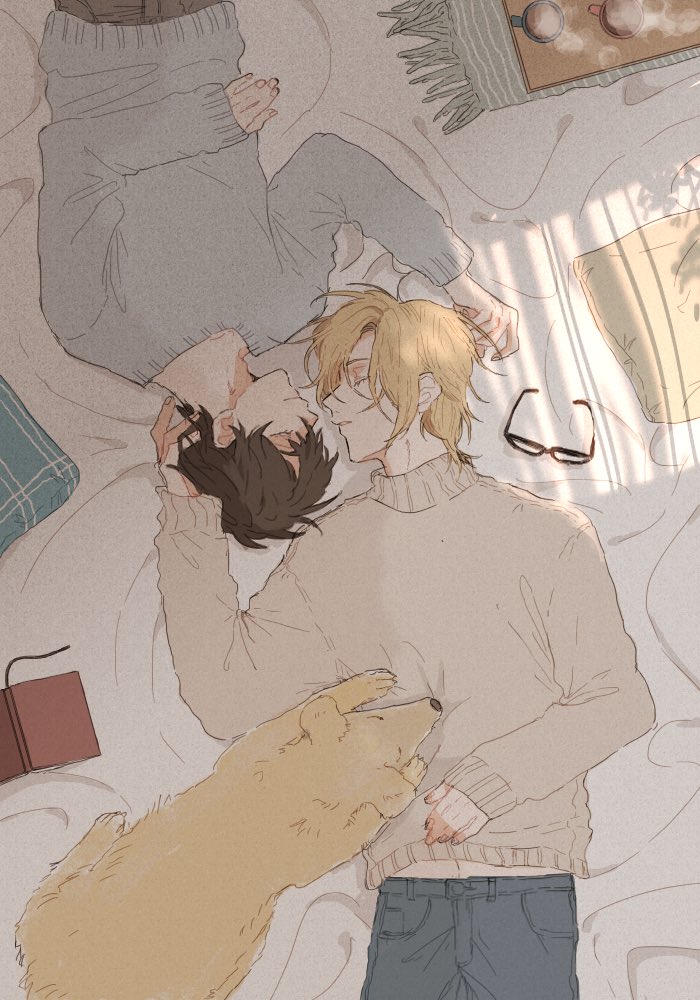 2boys a_co_pi animal arm_up ash_lynx banana_fish black-framed_eyewear black_hair blonde_hair blue_pants blue_sweater book closed_eyes closed_mouth commentary_request denim dog from_above glasses golden_retriever grey_sweater hand_on_another's_head jeans long_sleeves male_focus multiple_boys okumura_eiji open_book pants parted_bangs pillow profile short_hair sleeves_past_wrists sweater unworn_eyewear yaoi