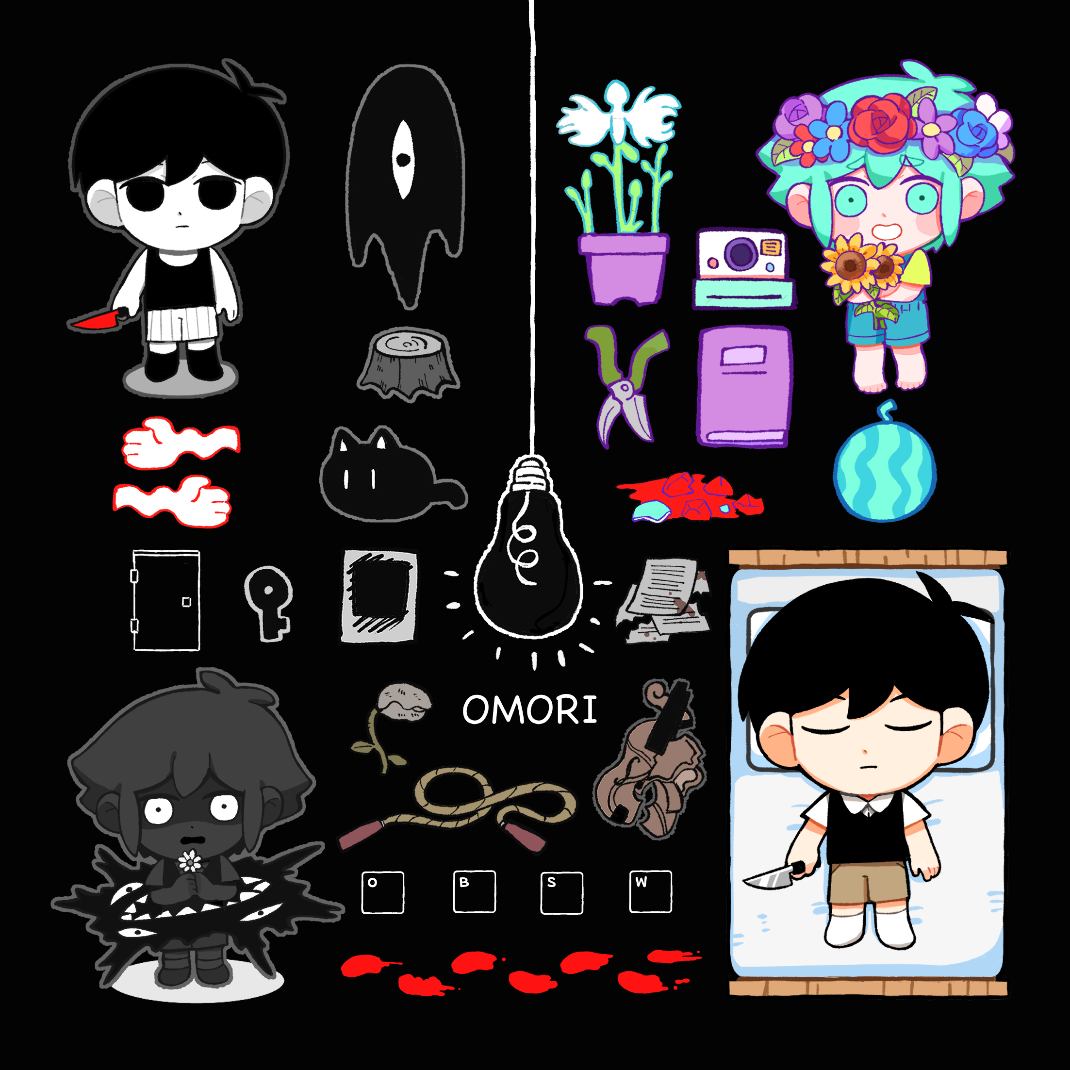 4boys antenna_hair barefoot basil_(headspace)_(omori) basil_(omori) black_eyes black_hair black_shirt black_shoes black_shorts black_skin black_socks black_sweater_vest black_tank_top blue_overalls blush brown_shorts camera chibi chibi_only closed_eyes closed_mouth collared_shirt colored_skin commentary_request double-parted_bangs dual_persona egret_orchid flower flower_pot flower_wreath food fruit gardening_shears green_eyes green_hair green_shirt hair_between_eyes head_on_pillow head_wreath highres holding holding_flower holding_knife instrument jump_rope key knife looking_at_viewer lying male_focus mapa_(wqgrkt_krbko) mewo multiple_boys omori omori_(omori) on_back on_bed open_mouth overall_shorts overalls pillow plant potted_plant sheet_music shirt shoes short_hair shorts sidelocks smile socks something_(omori) spoilers stranger_(omori) striped_clothes striped_shorts sunflower sunny_(omori) sweater_vest tank_top tree_stump tulip vertical-striped_clothes vertical-striped_shorts violin watermelon white_flower white_shirt white_shorts white_skin white_socks white_tulip