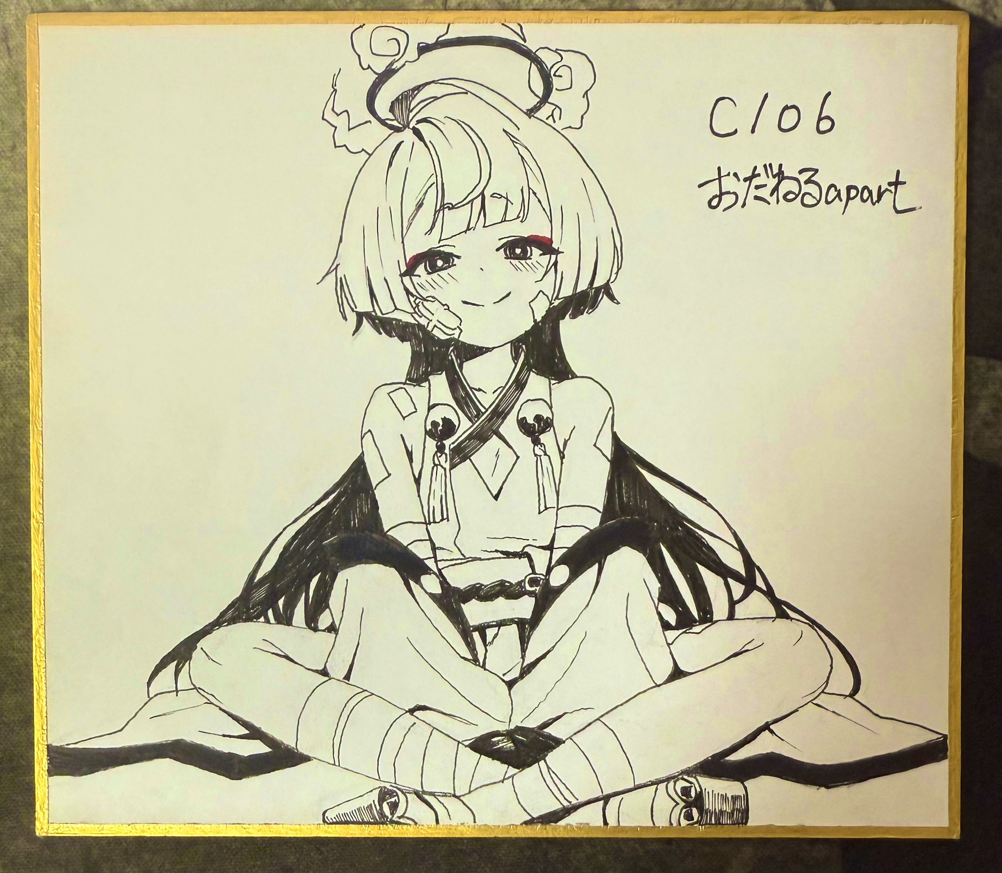 1girl bandaged_arm bandages blue_archive blush commentary_request flat_chest gauze gauze_on_cheek grey_hair halo highres indian_style long_hair looking_at_viewer monochrome odaneru_apart photo_(medium) shikishi shuro_(blue_archive) sideless_kimono sitting smile solo traditional_media