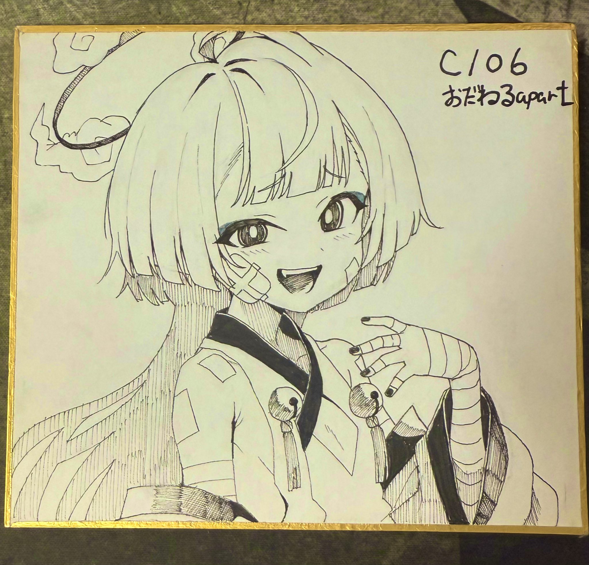 1girl bandaged_arm bandages blue_archive blush commentary_request flat_chest gauze gauze_on_cheek grey_hair halo highres looking_at_viewer monochrome odaneru_apart open_mouth photo_(medium) shikishi shuro_(blue_archive) sideless_kimono smile solo traditional_media