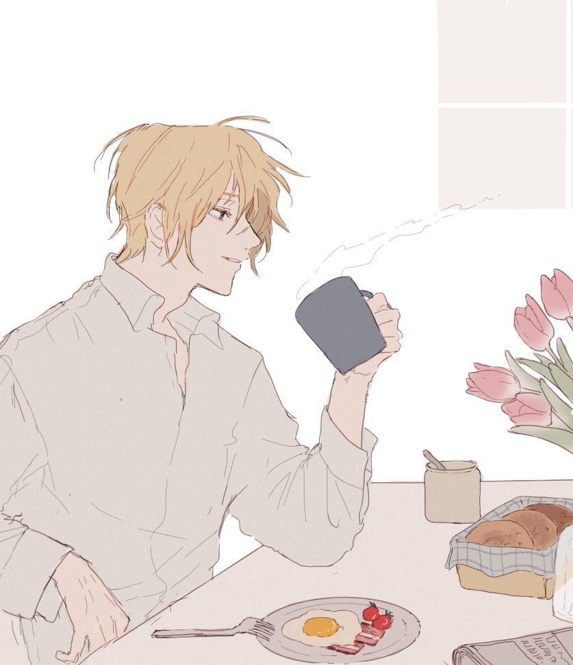 1boy a_co_pi ash_lynx banana_fish basket blonde_hair bread breakfast cherry_tomato coffee_mug collared_shirt commentary_request cup egg elbow_on_table elbow_rest flower food fork holding holding_cup male_focus mug open_collar parted_lips plant plate red_flower shirt sitting smile solo steam table tomato tulip white_background white_shirt wing_collar