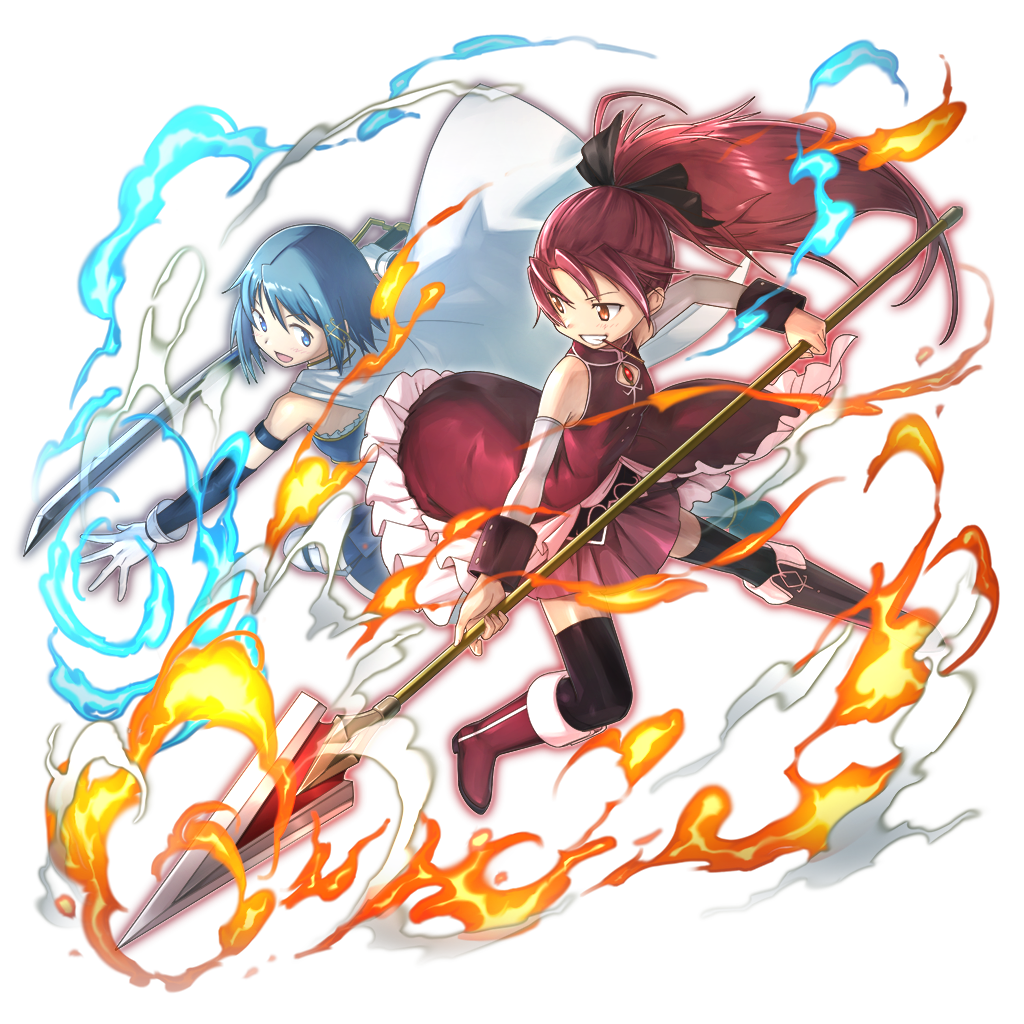 2girls armlet artist_request attack bare_shoulders belt black_bow black_shirt black_thighhighs black_wrist_cuffs blue_belt blue_eyes blue_hair blue_shirt blue_skirt blue_sleeves boots bow buttons cape chest_jewel cleavage_cutout clothing_cutout collared_cape collared_dress cutlass detached_sleeves dress fire floating_cape floating_clothes floating_hair food food_in_mouth fortissimo frilled_dress frilled_shirt frills full_body furrowed_brow game_cg gem gloves grand_summoners grey_outline grin hair_bow hair_ornament hairclip happy high_collar high_heel_boots high_heels holding holding_polearm holding_sword holding_weapon hydrokinesis jewelry knee_boots long_dress long_hair long_sleeves looking_at_another mahou_shoujo_madoka_magica miki_sayaka miniskirt multiple_girls musical_note musical_note_hair_ornament official_art open_mouth outline pink_skirt pleated_skirt pocky pocky_in_mouth polearm ponytail pyrokinesis red_boots red_dress red_eyes red_gem red_hair red_outline sakura_kyoko shirt shirt_under_dress short_hair skirt skirt_under_dress sleeveless sleeveless_dress smile spear steam strapless strapless_shirt sword tailcoat tareme thigh_belt thigh_strap thighhighs third-party_source transparent_background tsurime two-tone_shirt very_long_hair water weapon white_cape white_gloves white_shirt white_sleeves white_thighhighs wrist_cuffs