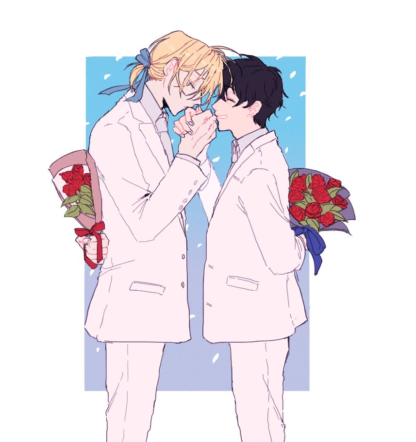 2boys a_co_pi arm_behind_back arm_up ash_lynx banana_fish black_hair blonde_hair blue_ribbon bouquet closed_eyes collared_shirt commentary_request couple flower formal_clothes from_side grin hair_ribbon holding holding_bouquet holding_hands jacket kiss kissing_hand lapels long_sleeves male_focus multiple_boys notched_lapels okumura_eiji pants parted_bangs ponytail red_flower red_rose ribbon rose shirt short_hair smile standing suit suit_jacket white_jacket white_pants white_shirt white_suit wing_collar yaoi