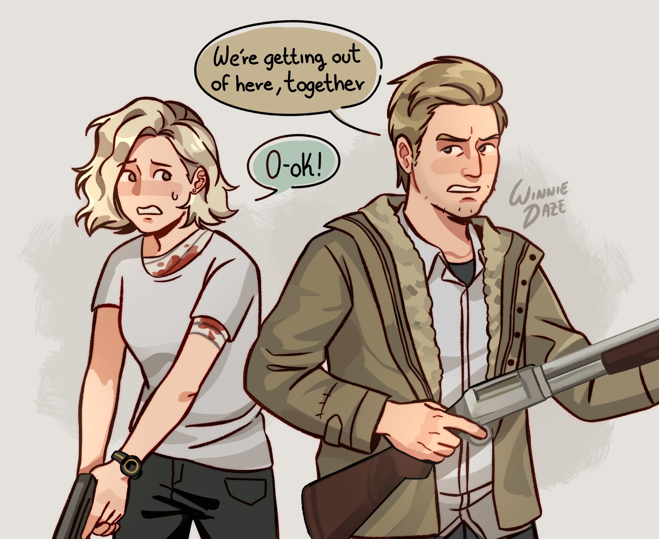 1boy 1girl artist_name blonde_hair commentary english_commentary english_text ethan_winters grace_ashcroft gun highres holding holding_gun holding_weapon jacket open_clothes open_jacket resident_evil resident_evil_requiem resident_evil_village signature weapon winnie62123994