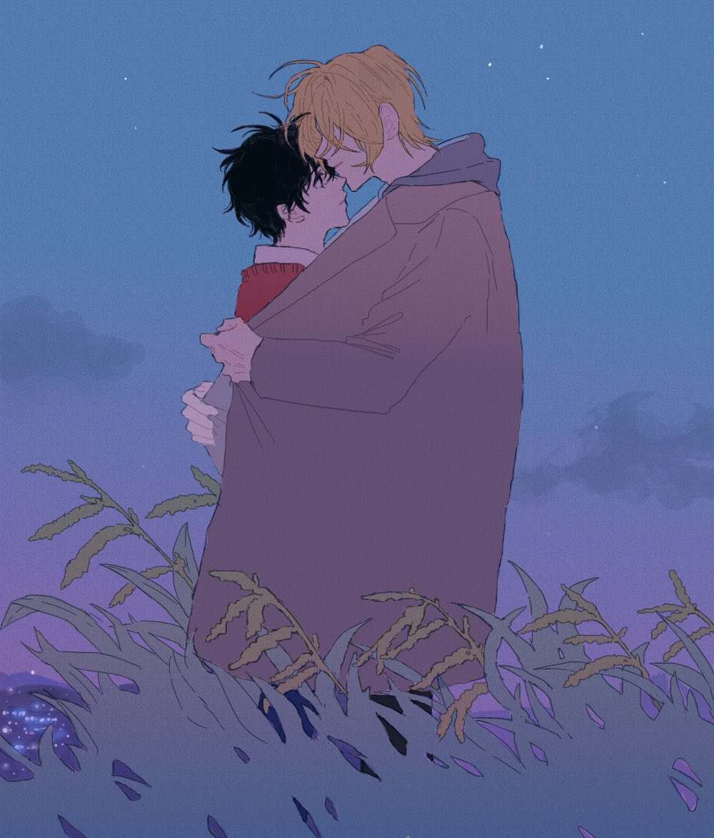 2boys a_co_pi ash_lynx banana_fish black_hair blonde_hair closed_mouth coat collared_shirt commentary_request field from_side grey_coat hair_behind_ear long_sleeves looking_at_another male_focus multiple_boys night okumura_eiji outdoors pants profile red_shirt shared_clothes shared_coat shirt sky standing white_shirt yaoi