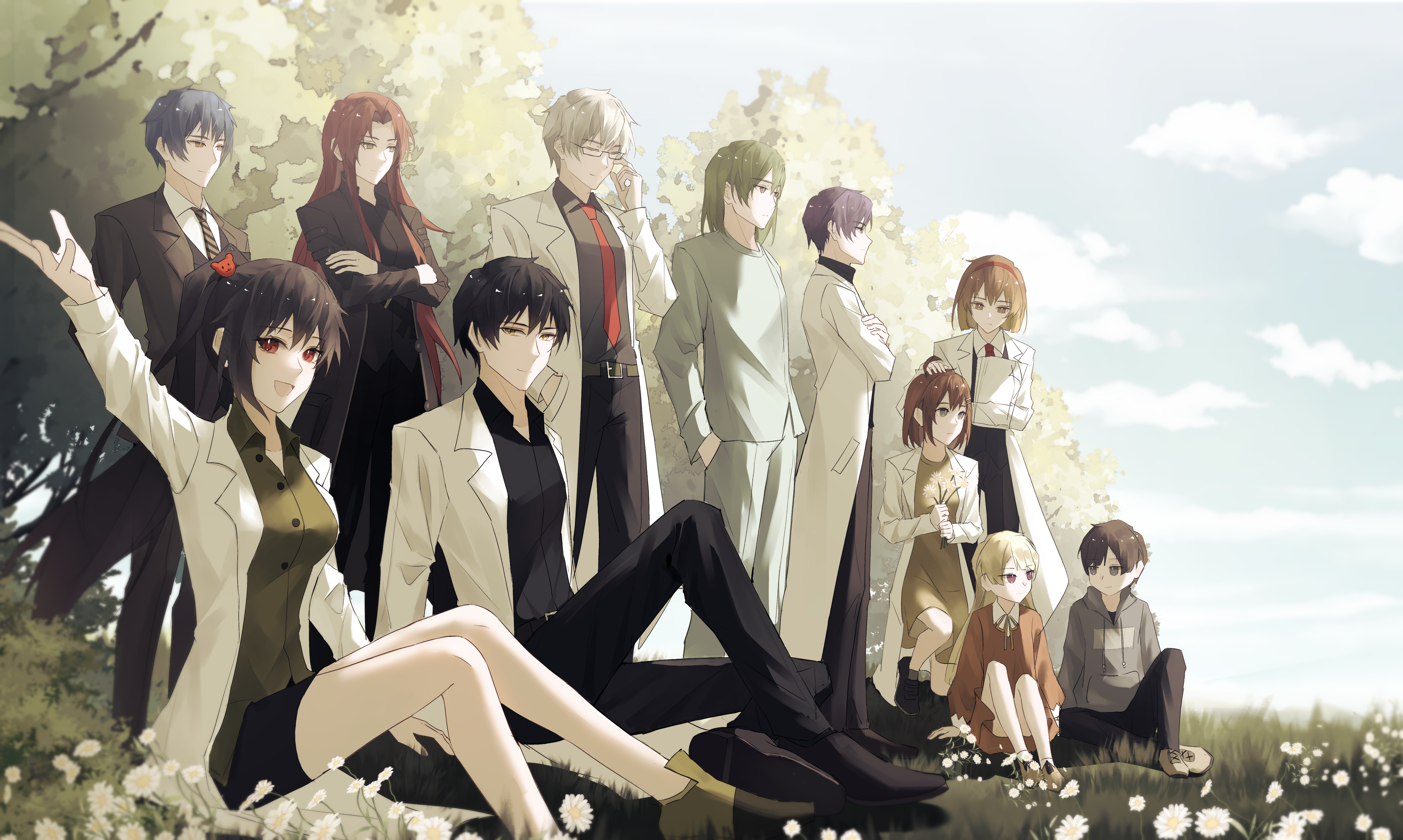 5girls 6+boys absurdres adjusting_eyewear ahoge arm_up ayin_(project_moon) bear_hair_ornament benjamin_(project_moon) black_hair black_jacket black_pants black_shirt black_skirt blonde_hair blue_hair brown_eyes brown_hair carmen_(project_moon) closed_eyes cloud cloudy_sky coat collared_shirt commentary_request crossed_arms daisy_(flower) daniel_(project_moon) day dress elijah_(project_moon) enoch_(project_moon) everyone flower formal_clothes gabriel_(project_moon) giovanni_(project_moon) glasses grass green_eyes green_hair green_shirt grey_hair hair_ornament hand_in_pocket hand_on_another's_head highres holding holding_flower hood hoodie jacket kali_(project_moon) lab_coat lisa_(project_moon) lobotomy_corporation long_hair long_sleeves medium_hair michelle_(project_moon) multiple_boys multiple_girls nanan_qian neck_ribbon necktie on_ground open_clothes open_coat open_mouth outdoors pants pencil_skirt ponytail project_moon purple_eyes purple_hair red_eyes red_hair red_necktie ribbon shirt shoes short_hair sitting skirt sky smile smock socks standing suit tree yellow_eyes