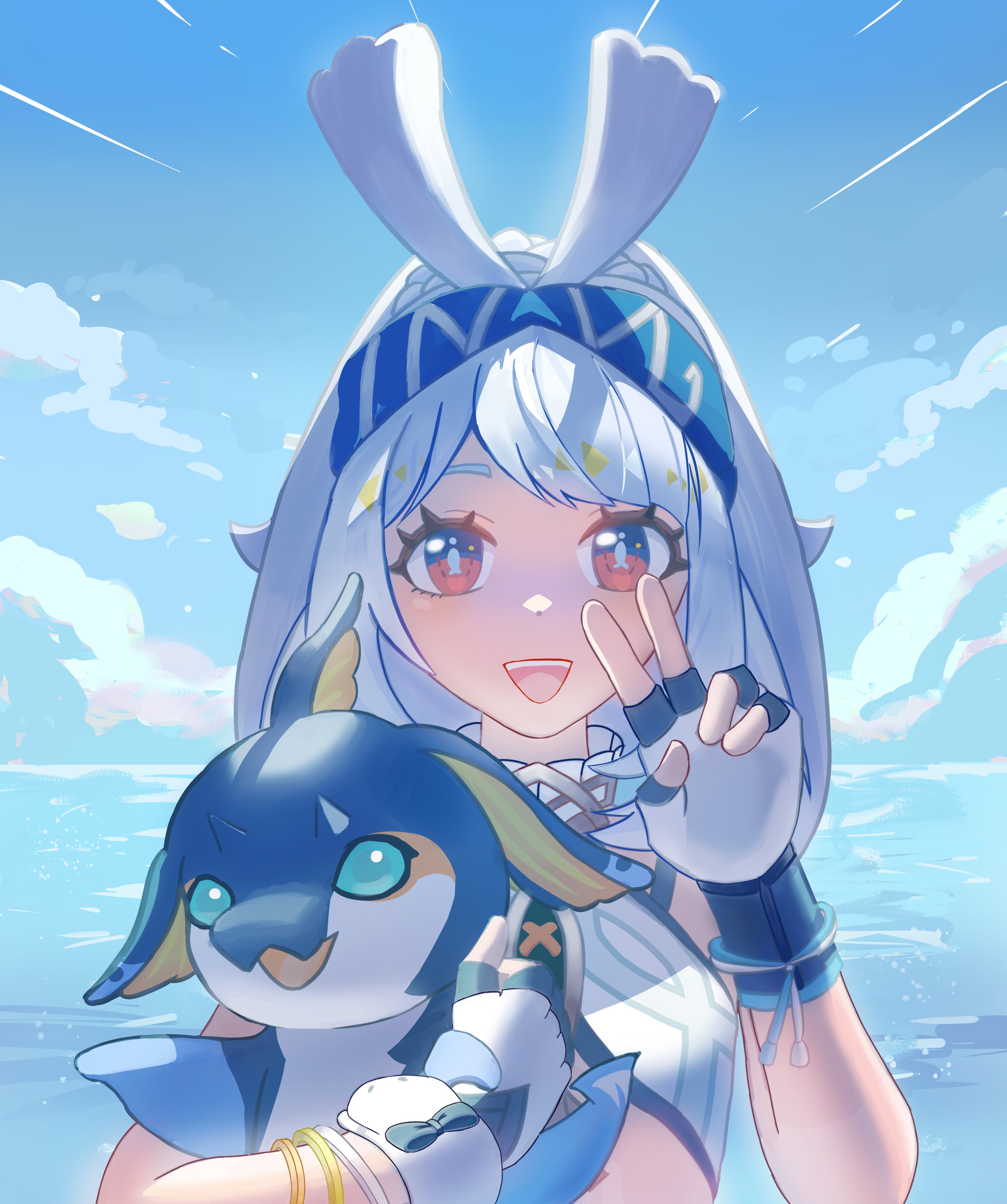 1girl absurdres animal blue_hairband commentary fingerless_gloves fish-shaped_pupils genshin_impact gloves hairband hand_up hawaiian_clothes highres holding holding_animal koholasaurus_(genshin_impact) long_hair looking_at_viewer mualani_(genshin_impact) ocean open_mouth outdoors raurel2712 red_eyes smile solo straight-on teeth upper_body upper_teeth_only v water white_gloves white_hair