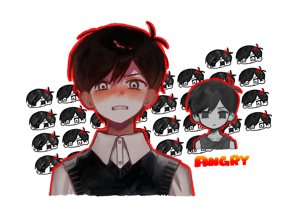 2boys angry antenna_hair black_eyes black_hair black_sweater_vest black_tank_top clenched_teeth closed_mouth collarbone collared_shirt colored_skin commentary dual_persona looking_at_viewer male_focus multiple_boys official_alternate_eye_color omori omori_(omori) open_mouth outline red_outline rou_(h_s_sinrin) shirt short_hair sunny_(omori) sweater_vest tank_top teeth white_eyes white_shirt white_skin