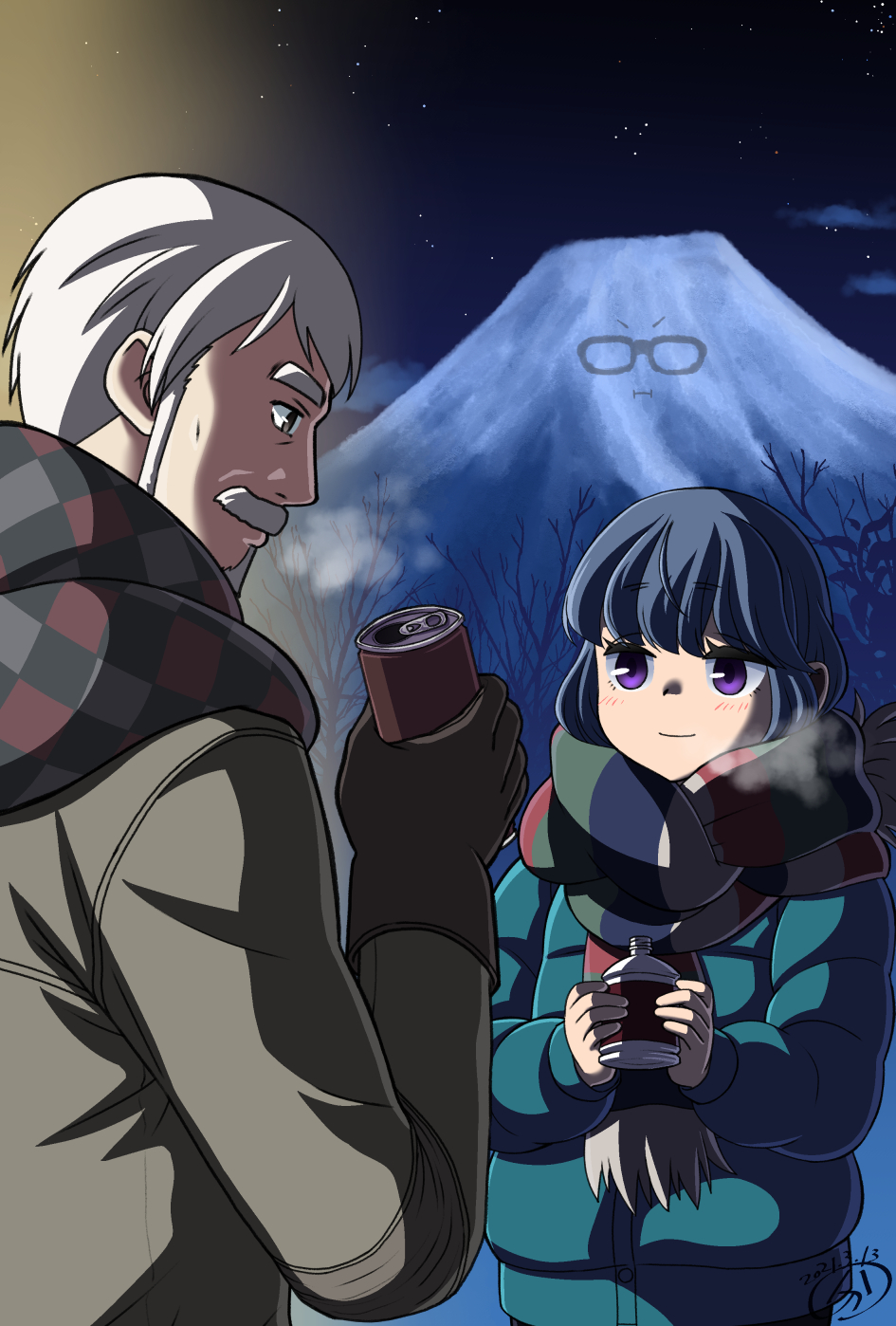 1boy 1girl bare_tree beard blue_hair blue_jacket blue_scarf bottle breath brown_gloves brown_jacket brown_scarf buntaichou can checkered_clothes checkered_scarf closed_mouth commentary_request dated down_jacket facial_hair gloves green_scarf grey_hair grey_scarf highres holding holding_bottle holding_can jacket long_sleeves looking_at_another mount_fuji multicolored_scarf mustache night oogaki_chiaki outdoors purple_eyes red_scarf scarf shima_rin shinshiro_hajime signature sky smile star_(sky) starry_sky striped_clothes striped_scarf tree upper_body volcano yurucamp