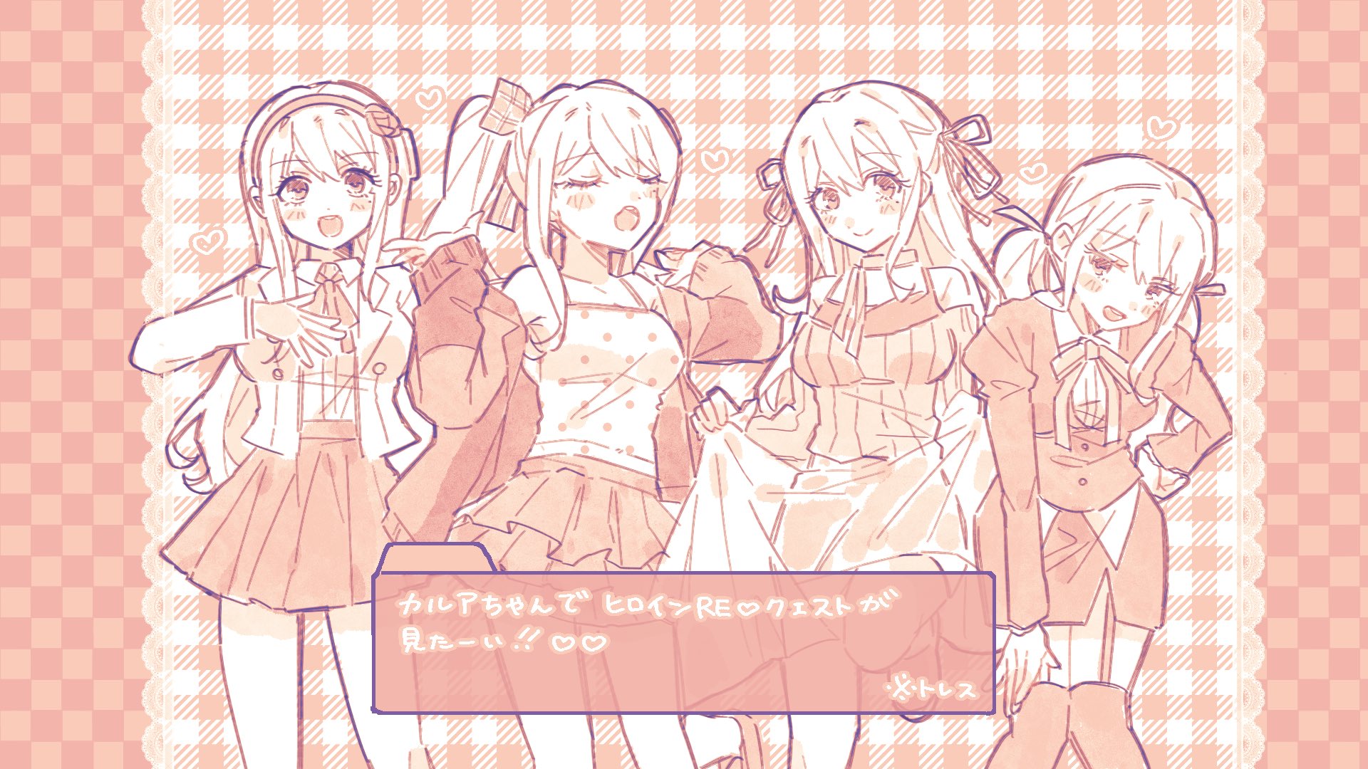 4girls :d :o alternate_costume alternate_hairstyle camisole closed_eyes commentary_request hairband hand_on_own_hip hand_up hands_up heroine_re_quest highres jacket kashimiya_karua leaning_forward long_hair looking_at_viewer monochrome multiple_girls multiple_persona neck_ribbon open_mouth orange_theme parody ribbon skirt smile swtr_hndr the_hundred_line_-last_defense_academy- thighhighs translation_request twintails video_game_dialogue_box