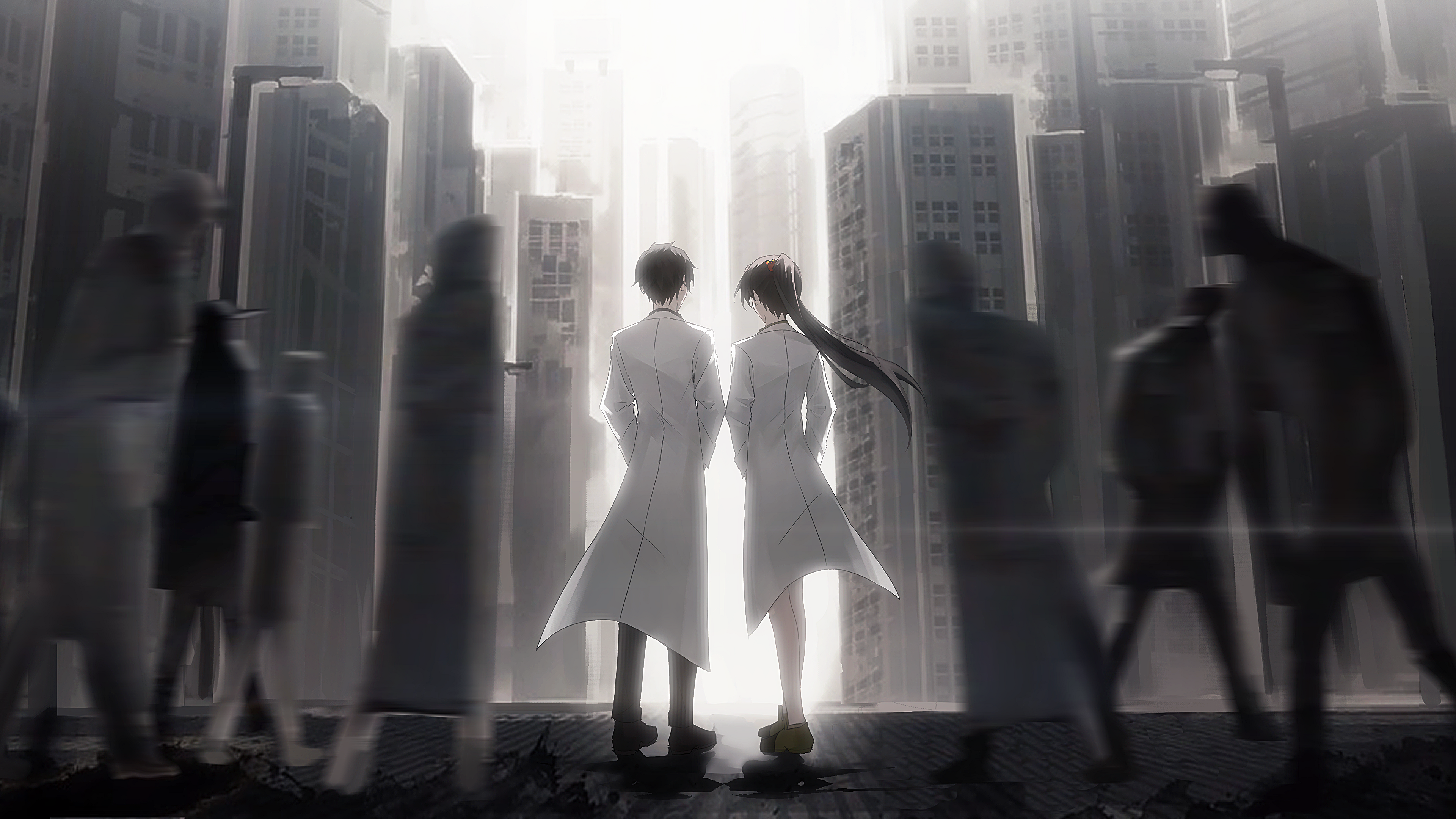 1boy 1girl absurdres ayin_(project_moon) black_hair black_pants blurry blurry_foreground building carmen_(project_moon) city cityscape commentary_request facing_away from_behind full_body hand_in_pocket hands_in_pockets highres lab_coat lobotomy_corporation long_hair multiple_boys nanan_qian outdoors pants people ponytail project_moon road shoes short_hair sky skyscraper standing street white_sky