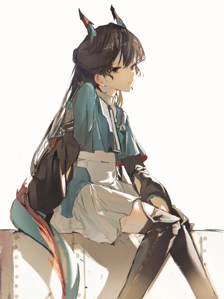 1girl arknights arknights:_endfield black_boots black_hair black_jacket blue_horns blue_tail boots chen_qianyu_(arknights) commentary dragon_horns dragon_tail eastern_dragon_horns eastern_dragon_tail feet_out_of_frame from_side grey_eyes horns jacket long_hair looking_at_viewer miniskirt sitting skirt solo tail thigh_boots white_background white_skirt zuruko880