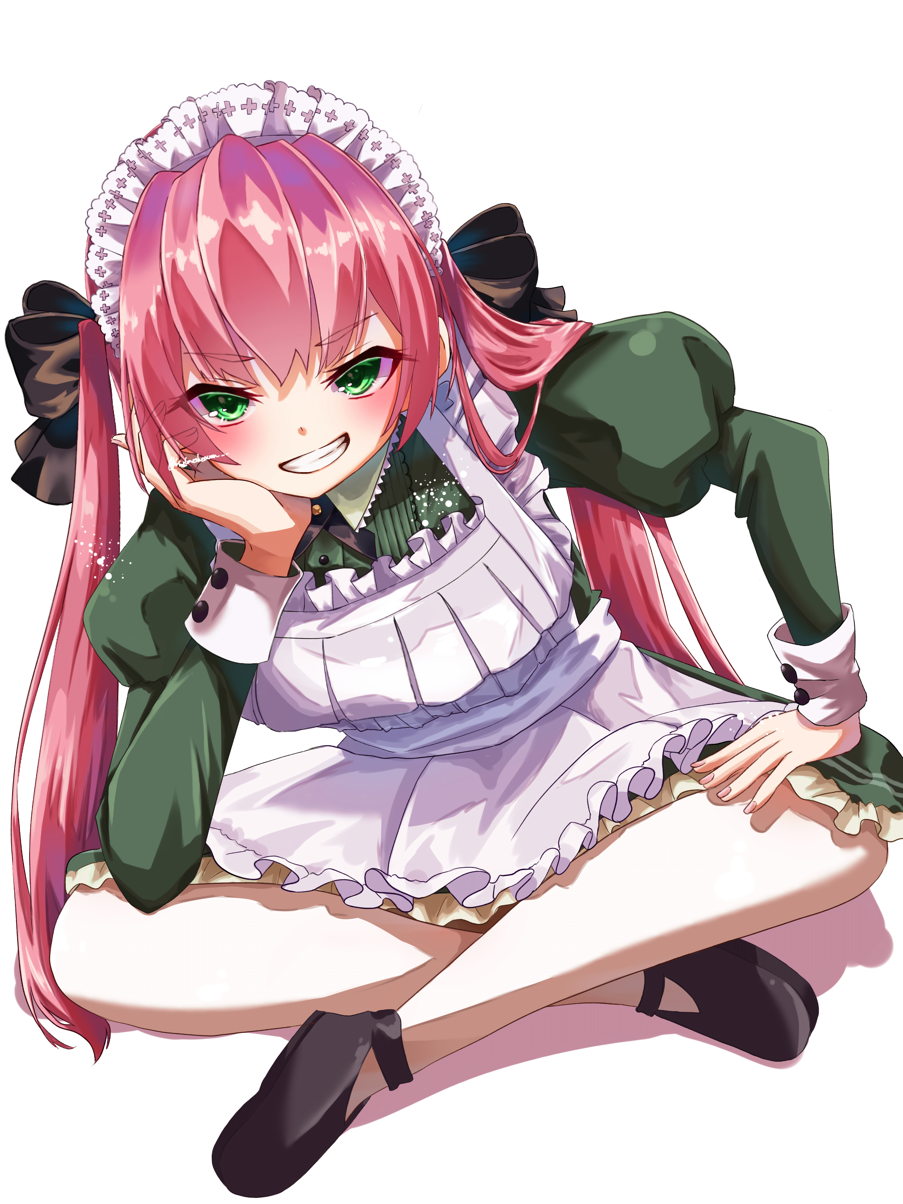 1girl :d absurdres aikawa_megumi alternate_costume alternate_hairstyle apron black_bow black_shoes blush bow commentary_request dress enmaided frilled_apron frilled_dress frills full_body green_dress green_eyes grin hair_bow hair_over_shoulder hand_on_own_cheek hand_on_own_face hand_up heaven_burns_red highres holmes_hvbn indian_style juliet_sleeves leaning_forward long_hair long_sleeves looking_at_viewer maid maid_apron maid_headdress official_alternate_costume open_mouth pink_hair puffy_sleeves shoes simple_background sitting smile smug solo straight_hair twintails unconventional_maid v-shaped_eyebrows very_long_hair white_apron white_background