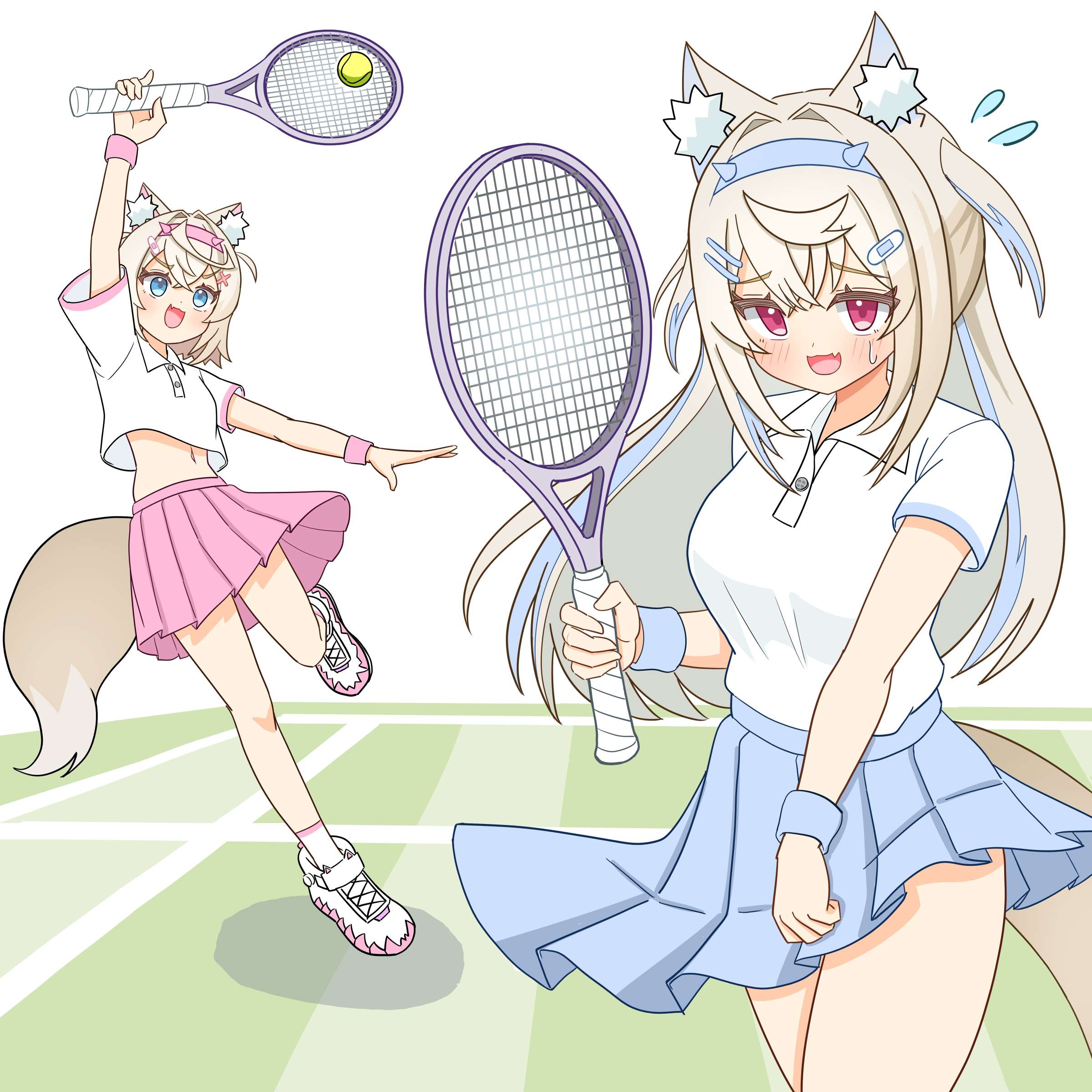 2girls absurdres alternate_costume animal_ear_fluff animal_ears ball bandaid bandaid_hair_ornament blonde_hair blue_eyes blue_skirt blue_streaks commentary_request dog_ears dog_girl dog_tail fuwawa_abyssgard hair_ornament hairpin highres holding holding_tennis_racket hololive hololive_english homapatti long_hair mococo_abyssgard multicolored_hair multiple_girls pink_skirt pink_streaks racket red_eyes shirt short_hair siblings sisters skirt sportswear streaked_hair tail tennis_ball tennis_racket tennis_uniform twins very_long_hair virtual_youtuber white_shirt x_hair_ornament
