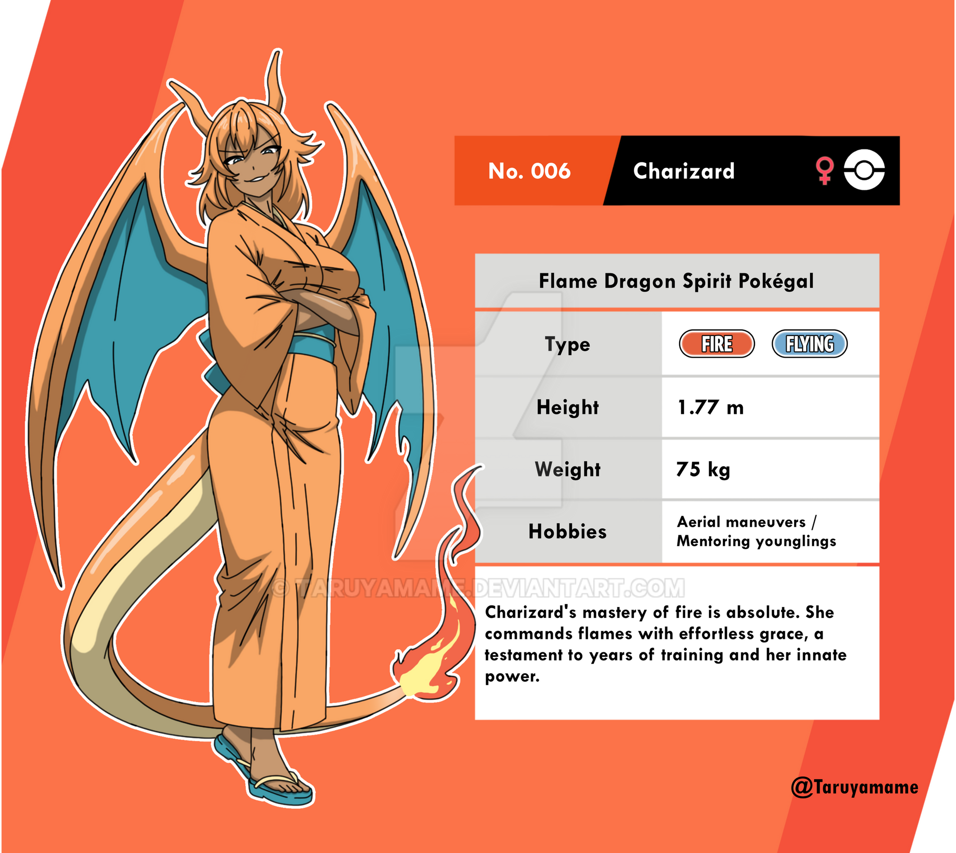 1girl artist_name blue_eyes blue_sash character_name character_profile charizard crossed_arms dark-skinned_female dark_skin deviantart_logo deviantart_username dragon_girl dragon_horns dragon_tail dragon_wings fiery_tail fire flip-flops full_body gen_1_pokemon height highres horns japanese_clothes kimono looking_at_viewer nintendo orange_background orange_hair orange_kimono personification pokedex_number pokemon pokemon_sword_and_shield sandals sash smirk tail taruyamame v-shaped_eyebrows weight wide_sleeves wings