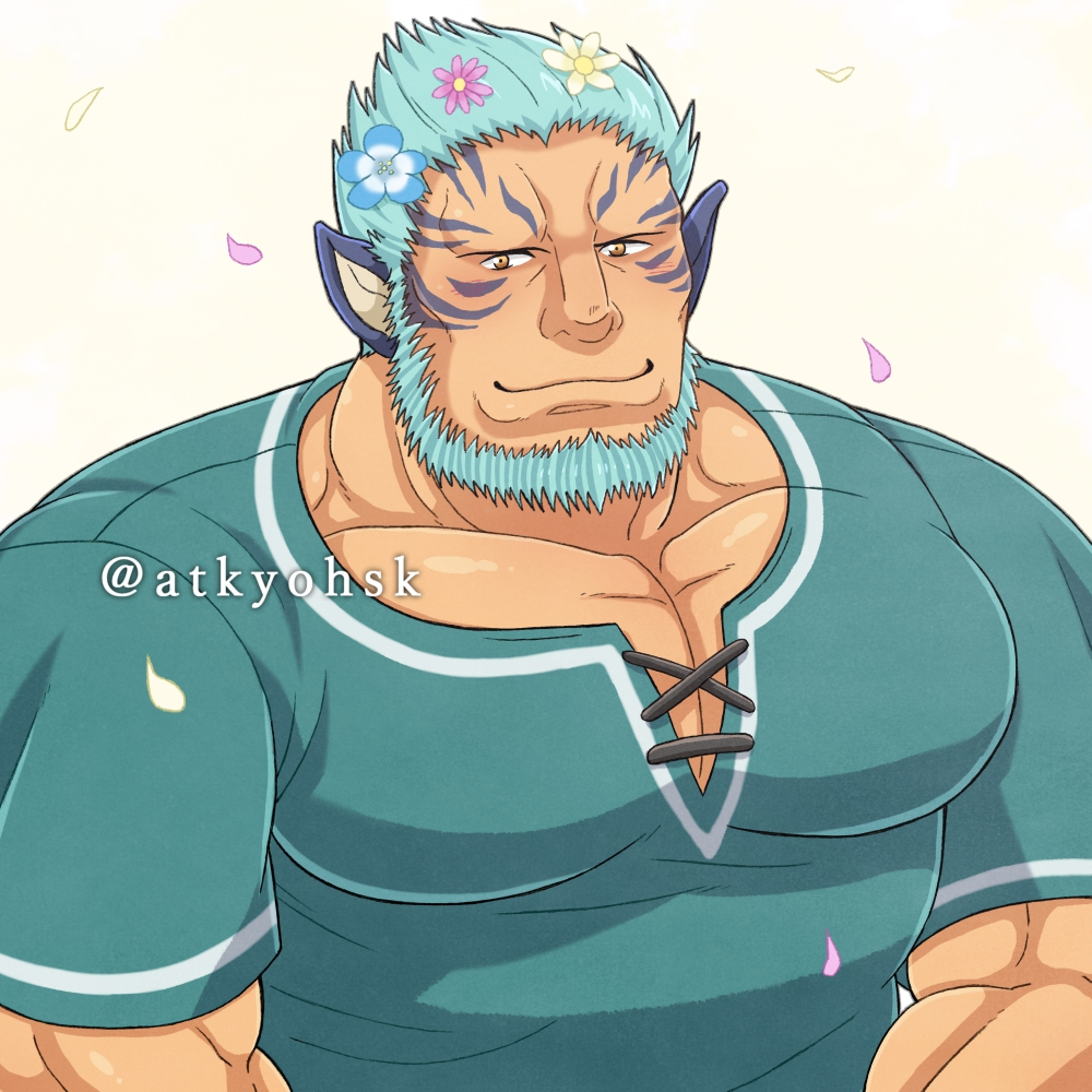 1boy animal_ears atkyohsk bara beard blue_hair closed_mouth facial_hair falling_petals fire_emblem fire_emblem:_path_of_radiance flower hair_flower hair_ornament looking_at_viewer male_focus mordecai_(fire_emblem) muscular muscular_male nintendo pectoral_cleavage pectorals petals short_hair solo thick_neck upper_body