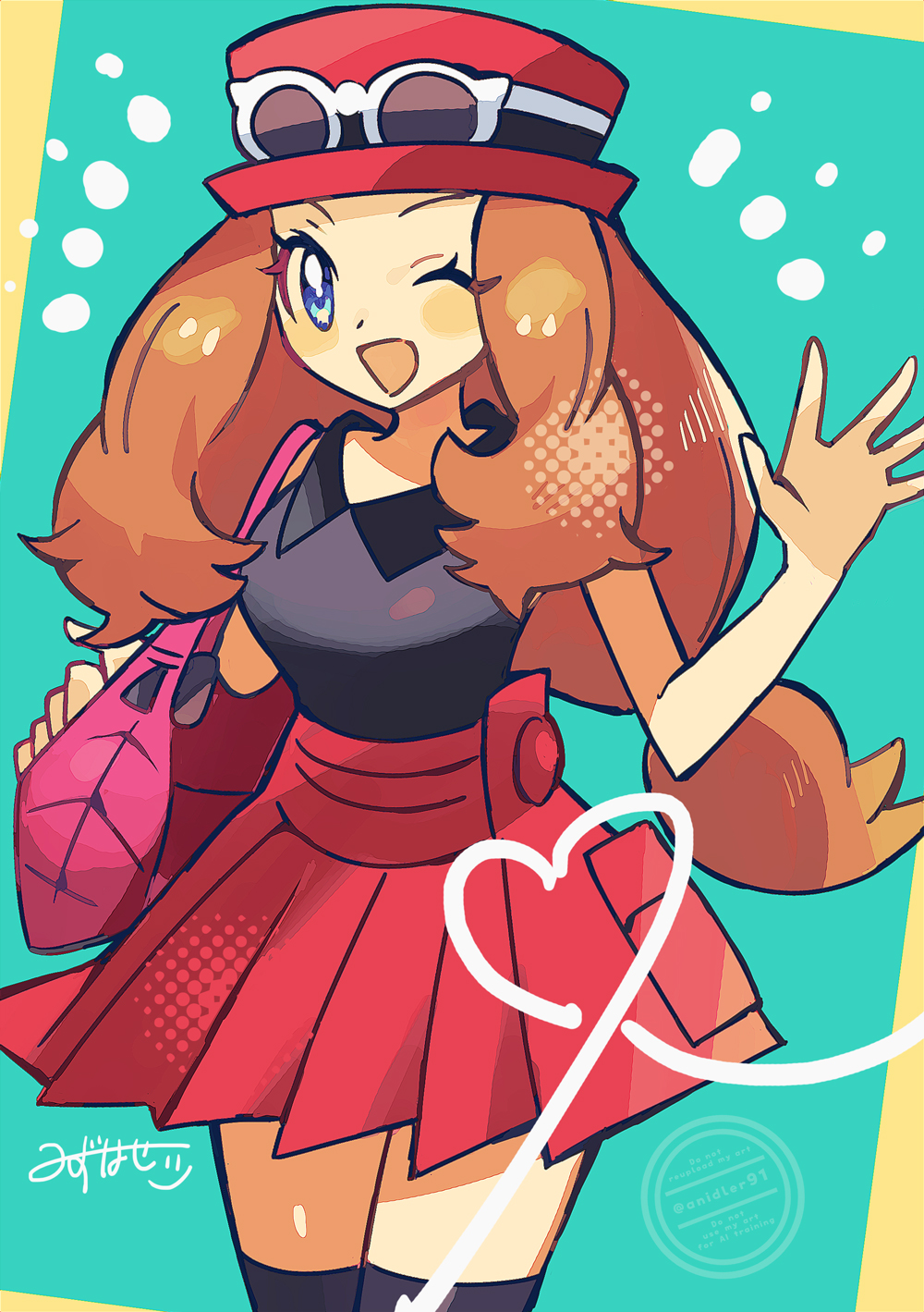 1girl anidler91 aqua_background black_shirt black_thighhighs blonde_hair blue_eyes collared_shirt commentary_request eyewear_on_head hat highres long_hair looking_at_viewer miniskirt nintendo one_eye_closed open_mouth pink_purse pokemon pokemon_x_and_y red_hat red_skirt serena_(pokemon) shirt skirt solo sunglasses thighhighs waving