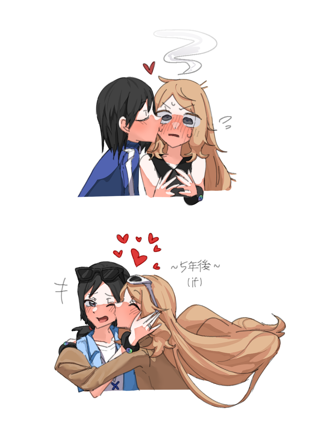 1boy 1girl aged_up black_hair blush brown_hair brown_jacket calem_(pokemon) closed_eyes commentary_request couple eyewear_on_head grey_eyes heart hetero highres hug jacket kiss kissing_cheek mega_ring mei_namul nintendo one_eye_closed pokemon pokemon_x_and_y serena_(pokemon) simple_background sunglasses upper_body white_background