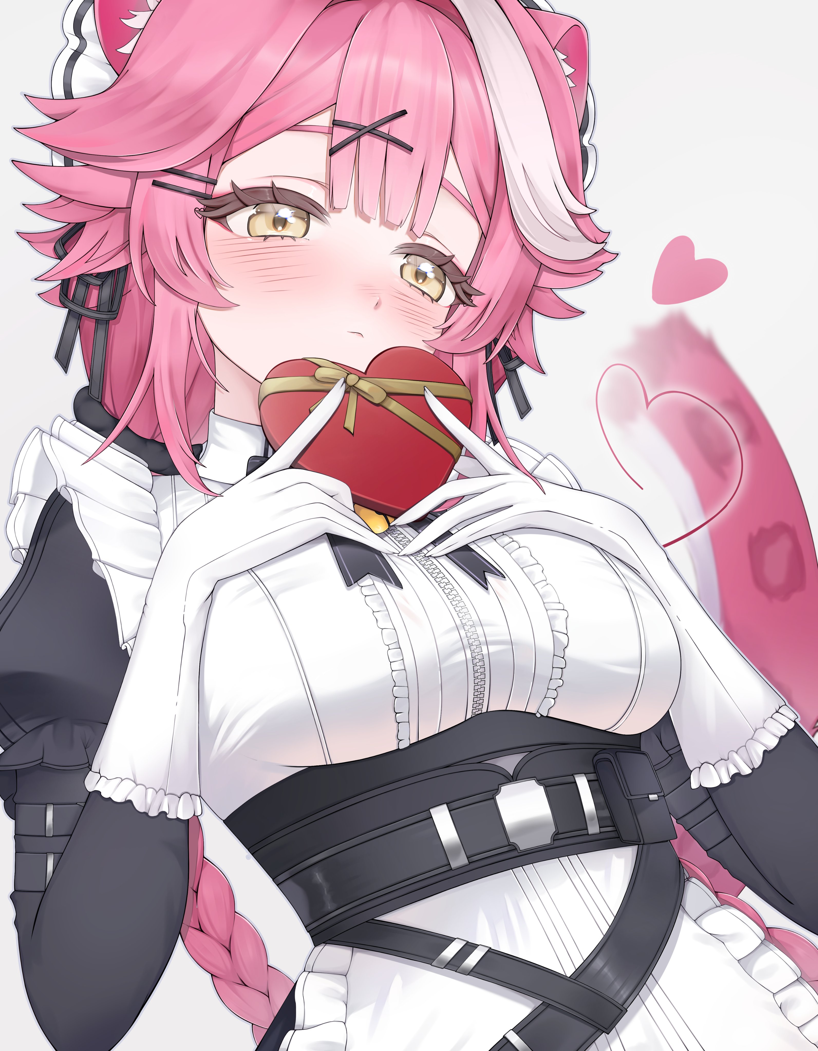 1girl absurdres animal_ears bell black_dress black_ribbon black_scrunchie blush box braid breasts brown_ribbon center_frills closed_mouth commentary dress english_commentary eyeshadow frilled_dress frills gloves grey_background hair_intakes hair_ornament hair_scrunchie hairclip heart heart-shaped_box highres holding holding_heart hololive hololive_english jingle_bell lilled long_hair maid_headdress makeup multicolored_hair neck_bell panther_ears panther_girl panther_tail pink_eyeshadow pink_hair pink_tail raora_panthera raora_panthera_(maid) ribbon scrunchie simple_background solo streaked_hair tail two-tone_hair virtual_youtuber white_dress white_gloves yellow_eyes zipper
